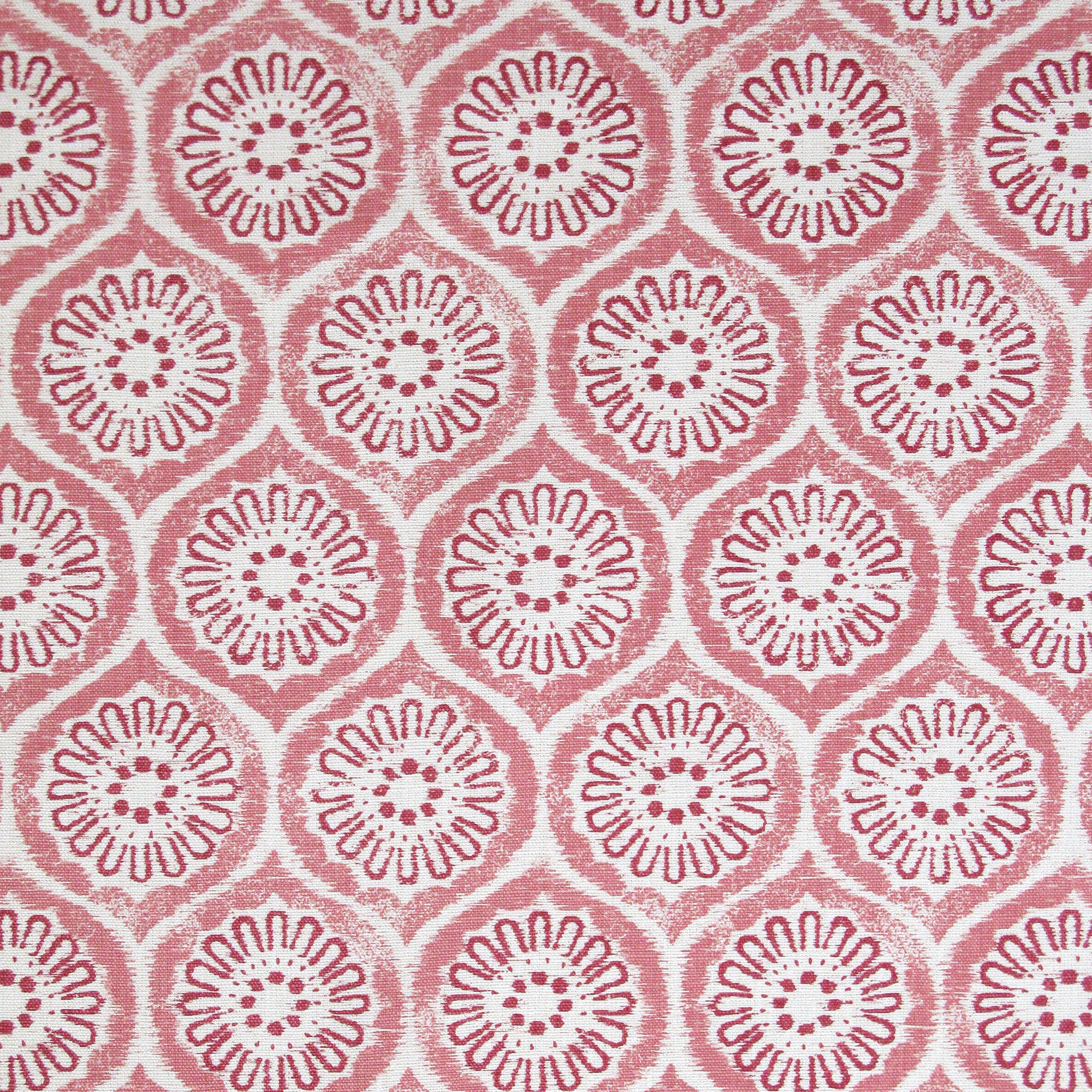 Detail of fabric in a floral lattice print in pink and red on a cream field.