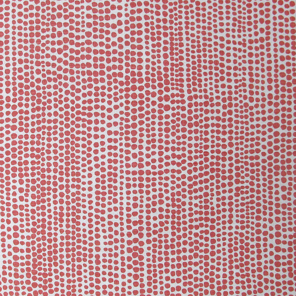 Detail of fabric in a painterly dotted print in coral on a white field.