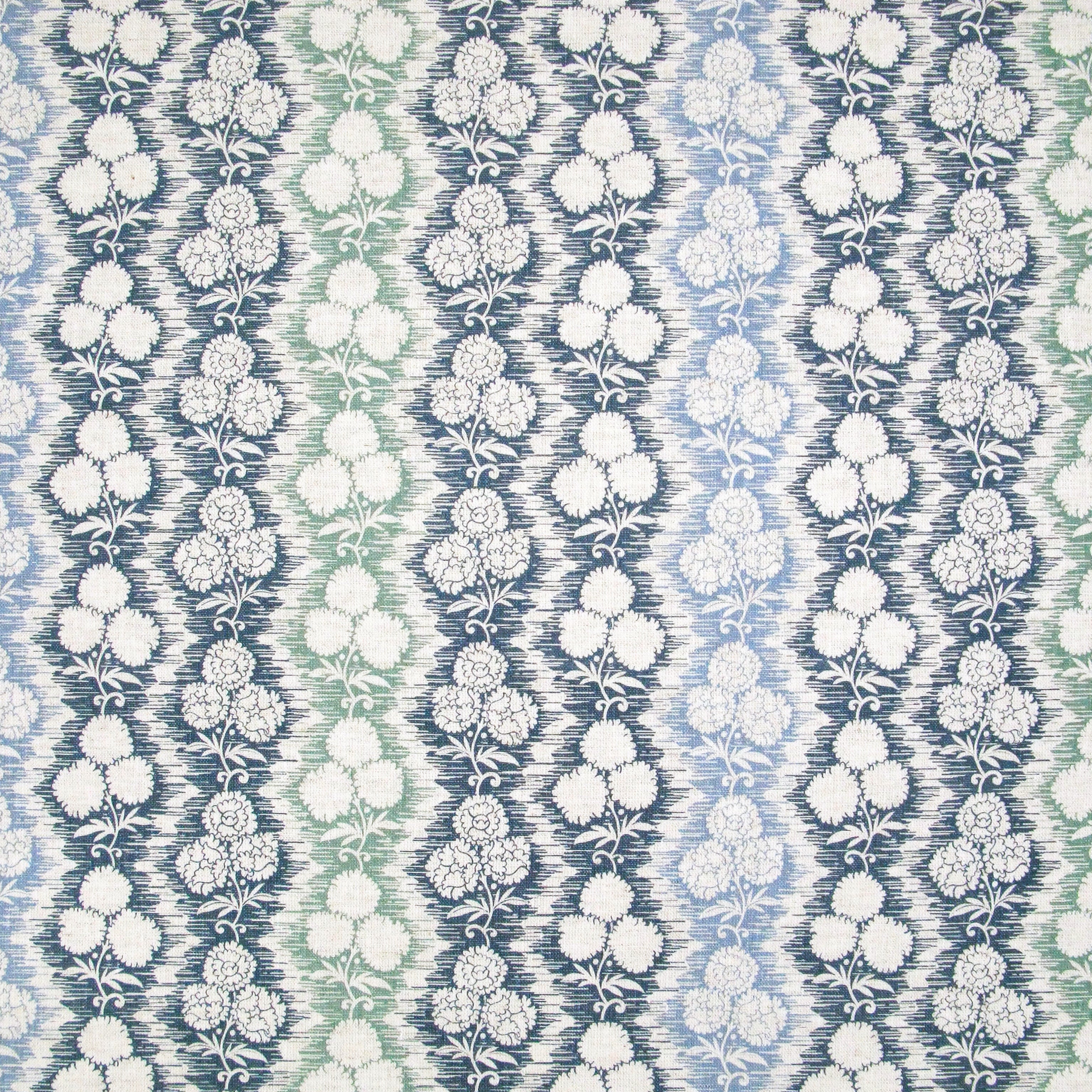 Fabric in a detailed botanical stripe print in shades of blue and green on a white field.