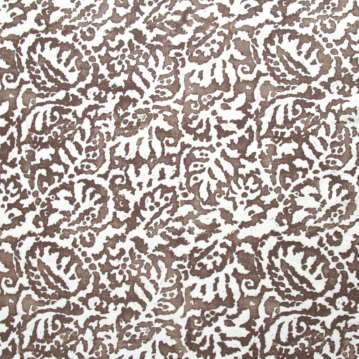 Fabric in a botanical paisley print in white on a brown field.
