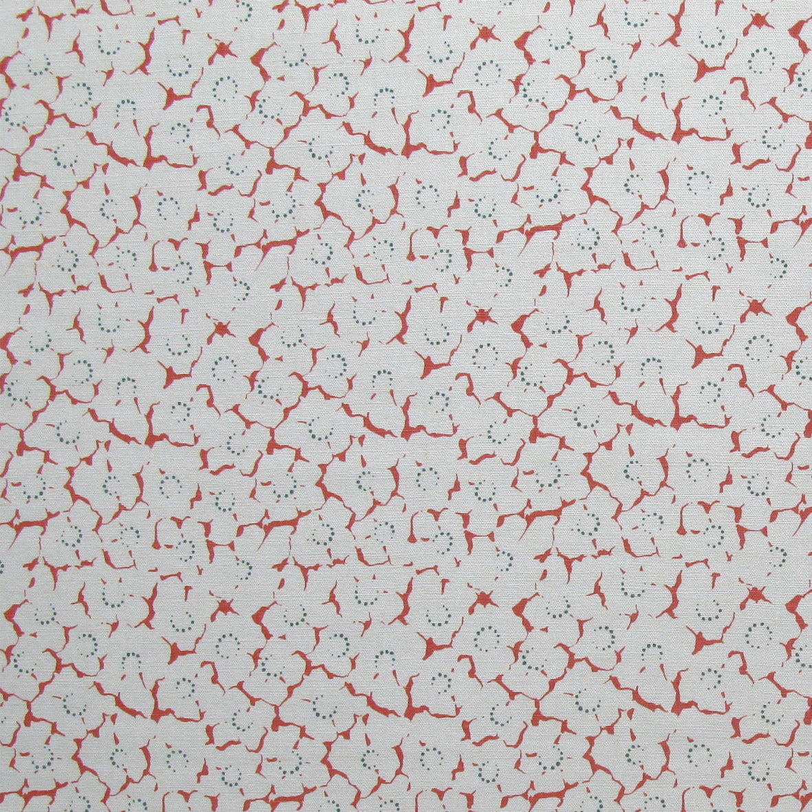 Fabric in a minimal floral print in blue and coral on a gray field.