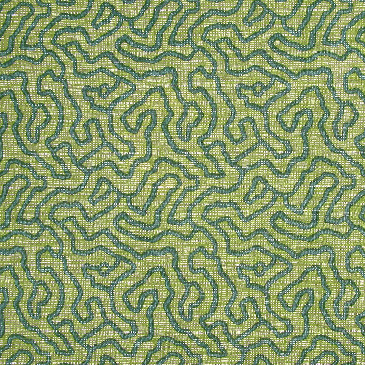Printed fabric in a meandering hand drawn line pattern in teal on a bright green field.