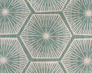 Fabric in a geometric lattice print in cream on a turquoise field.
