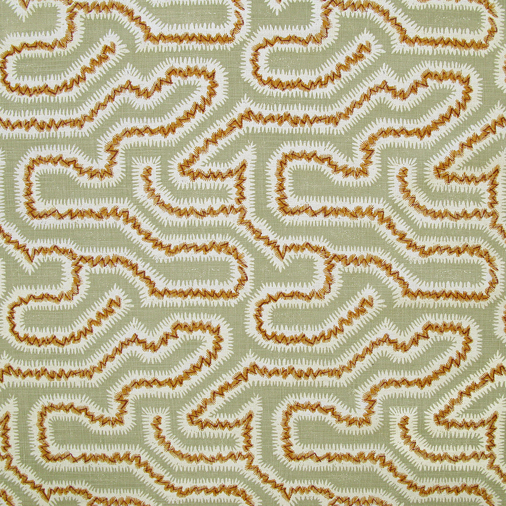 Detail of fabric in a dense meandering print in white, orange and red on a light green field.
