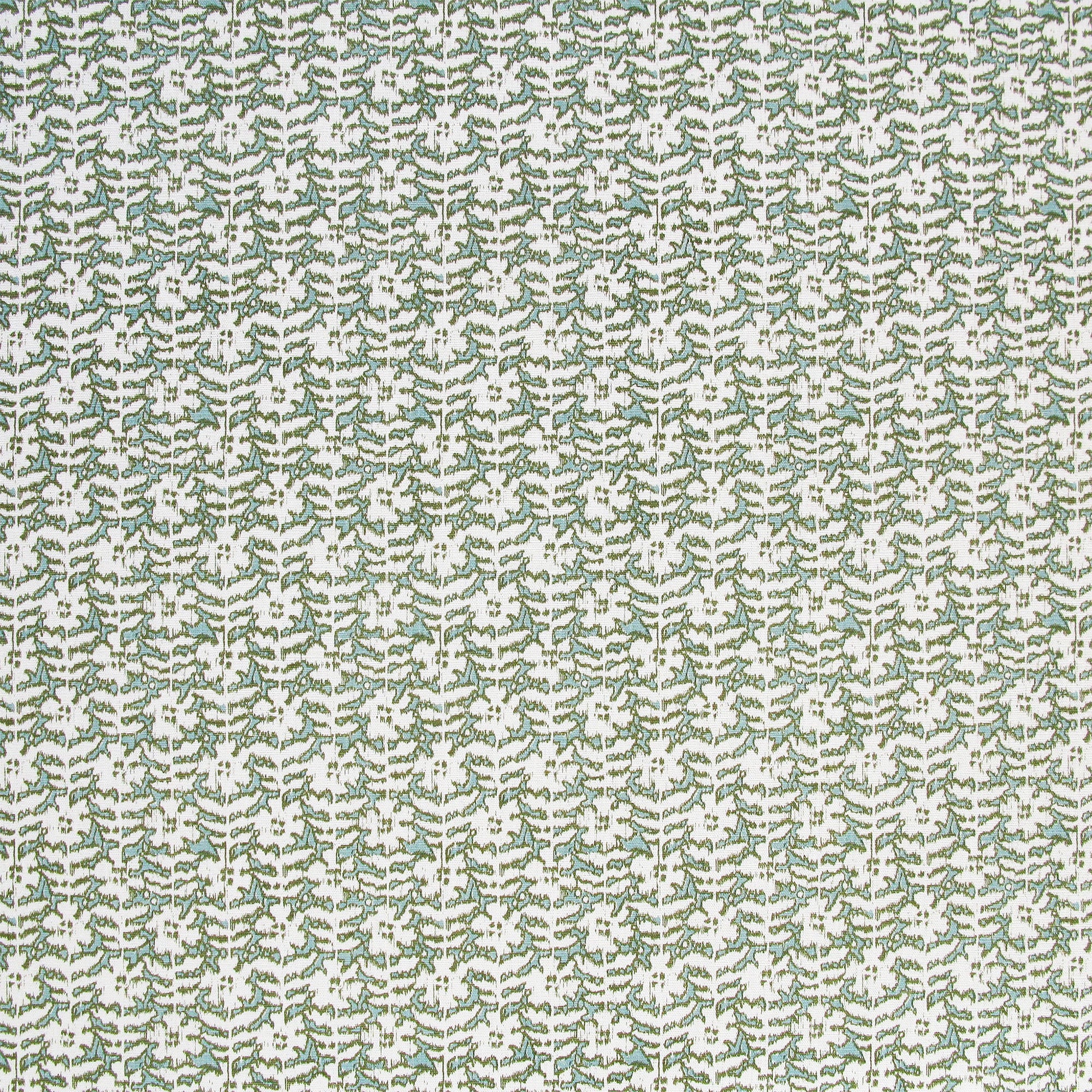 Detail of fabric in a floral grid print in white and sage on a light green field.