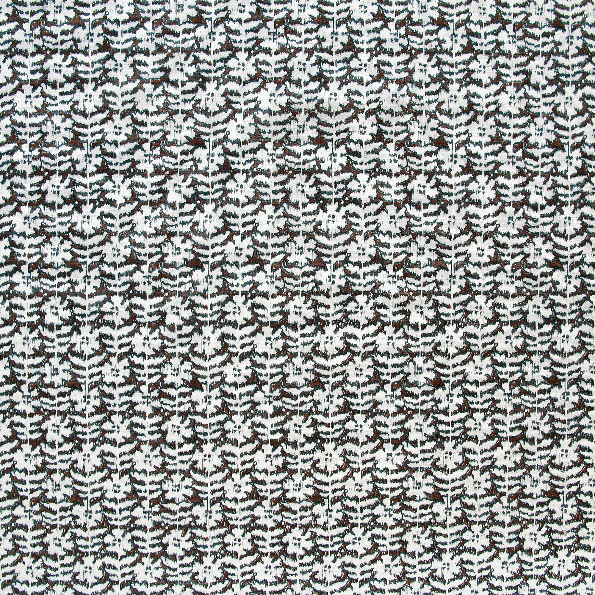 Detail of fabric in a floral grid print in white on a dark brown field.