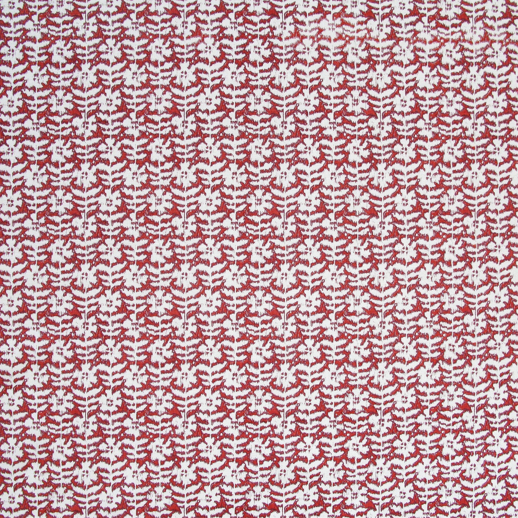 Detail of fabric in a floral grid print in white and maroon on a red field.