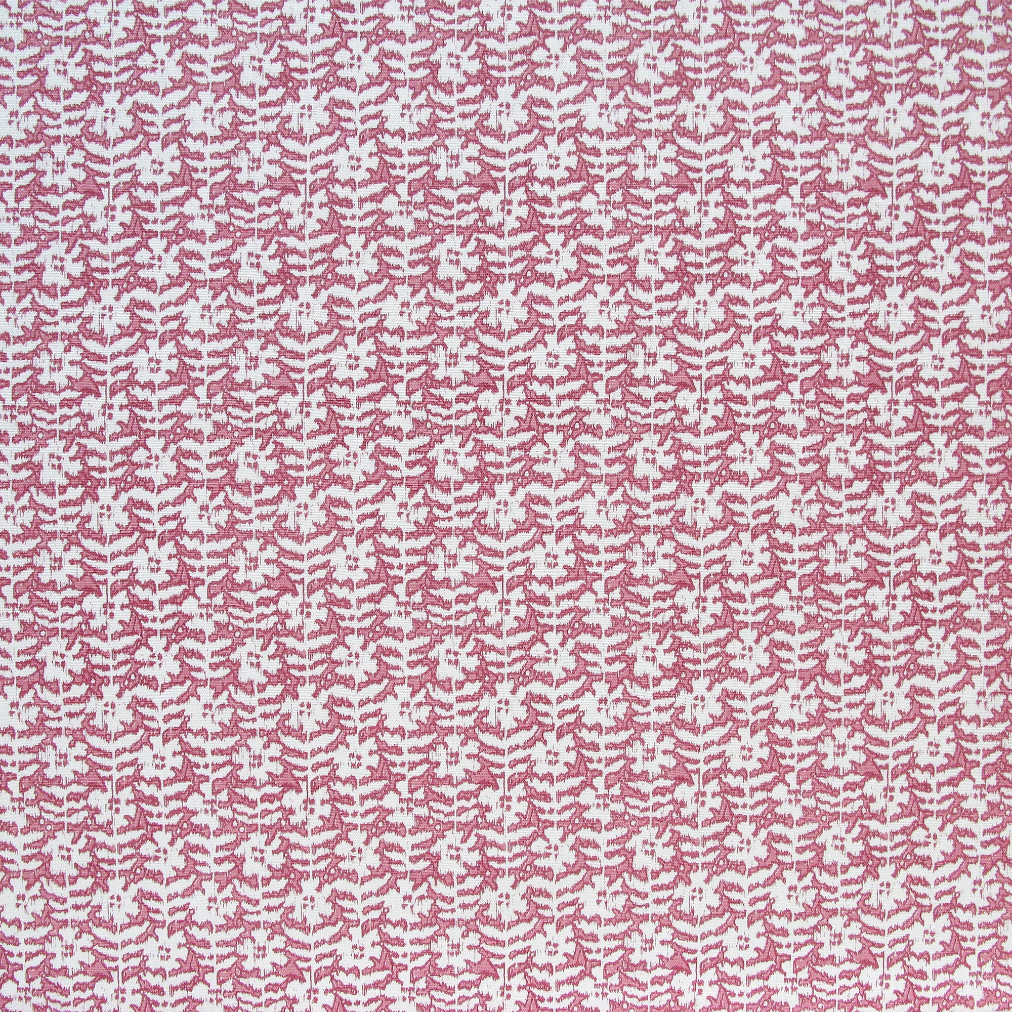Detail of fabric in a floral grid print in white and red on a pink field.