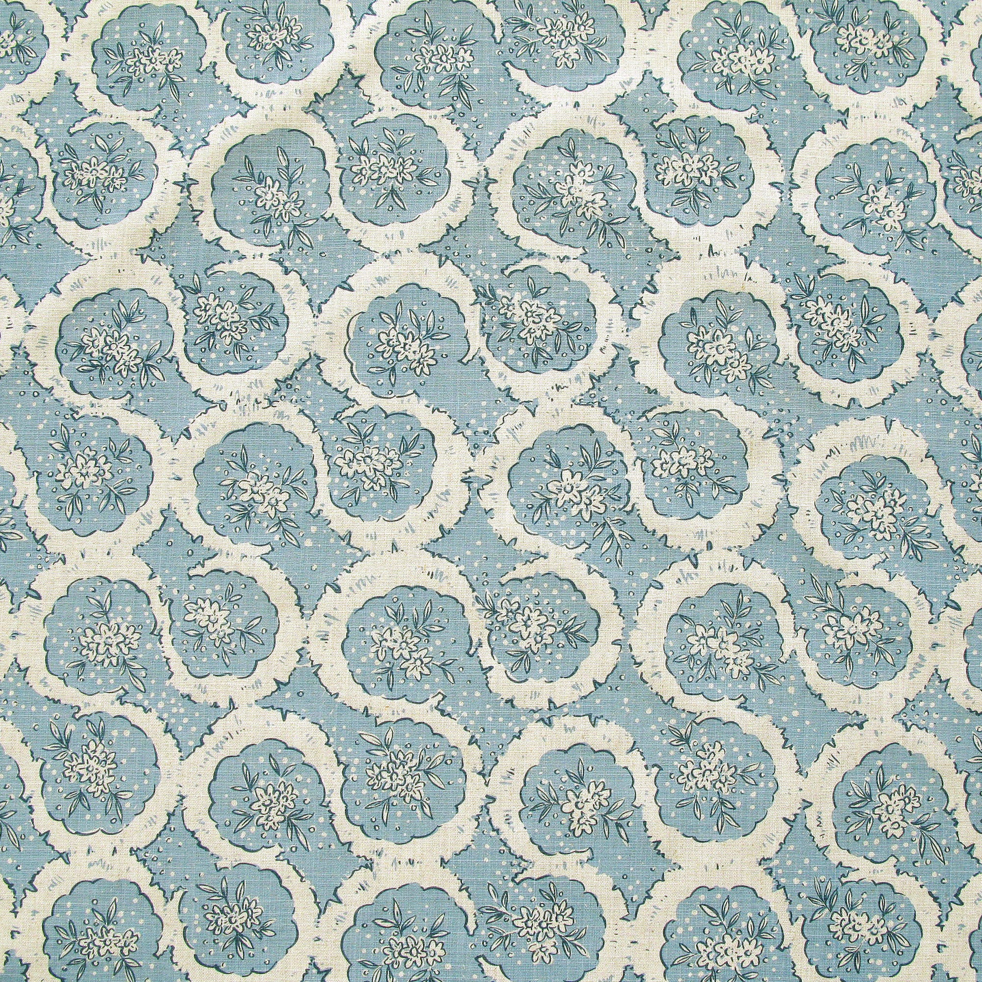 Detail of fabric in a meandering floral grid print in cream and navy on a light blue field.