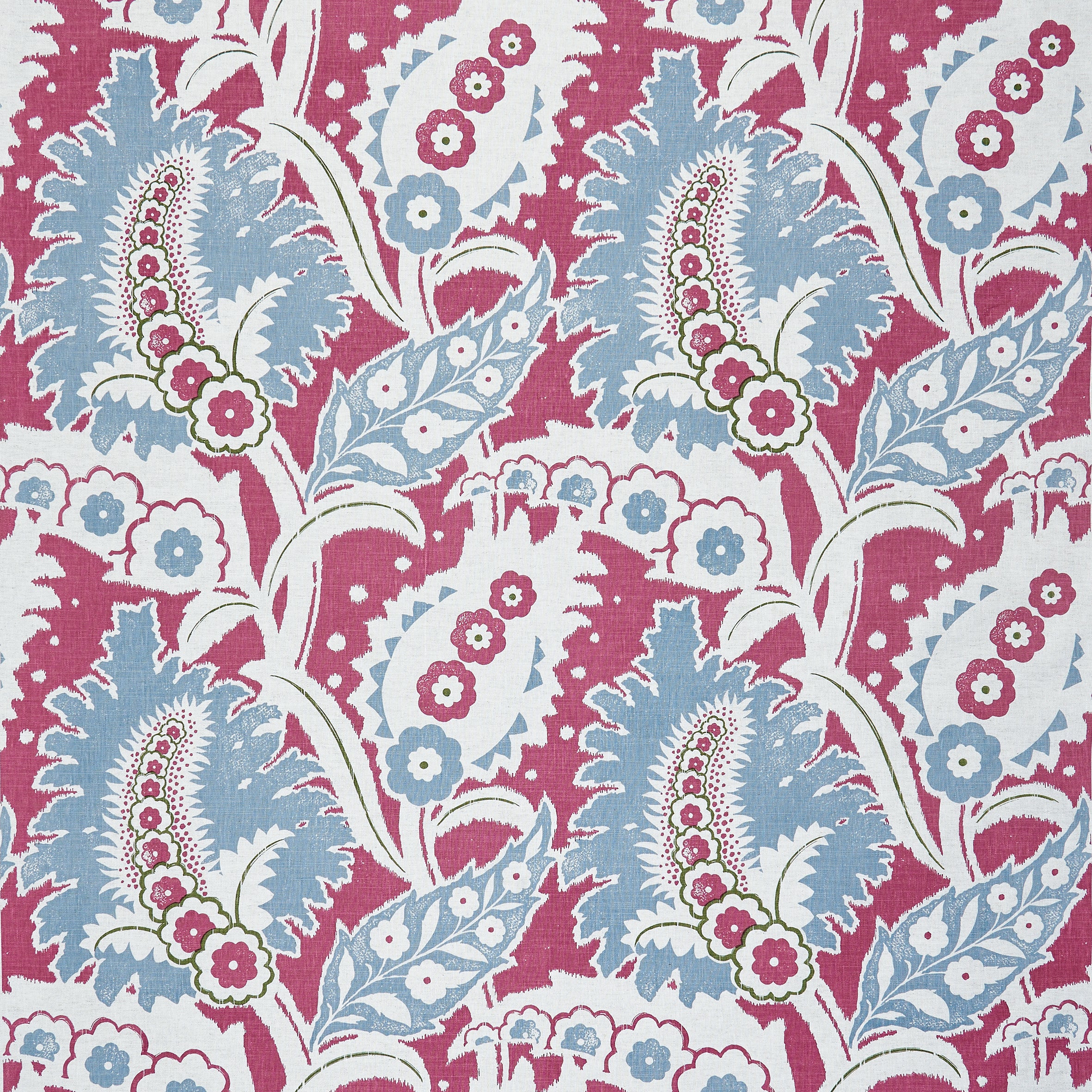 Detail of fabric in a botanical paisley print in shades of white, blue and green on a pink field.