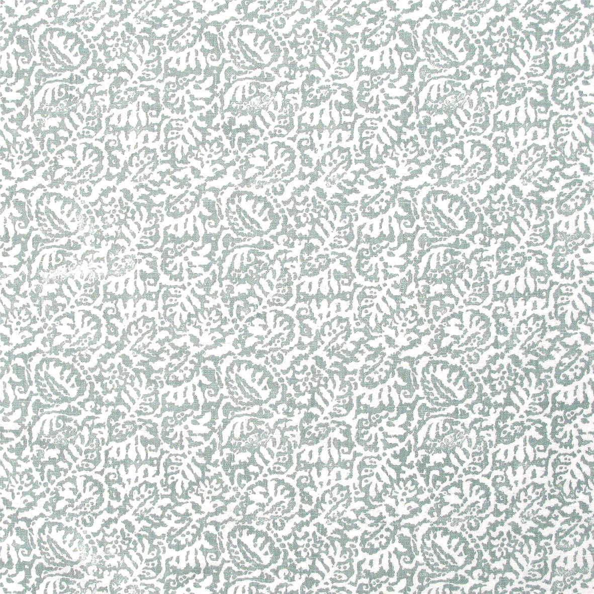Detail of fabric in a dense paisley print in white on a gray-blue field.