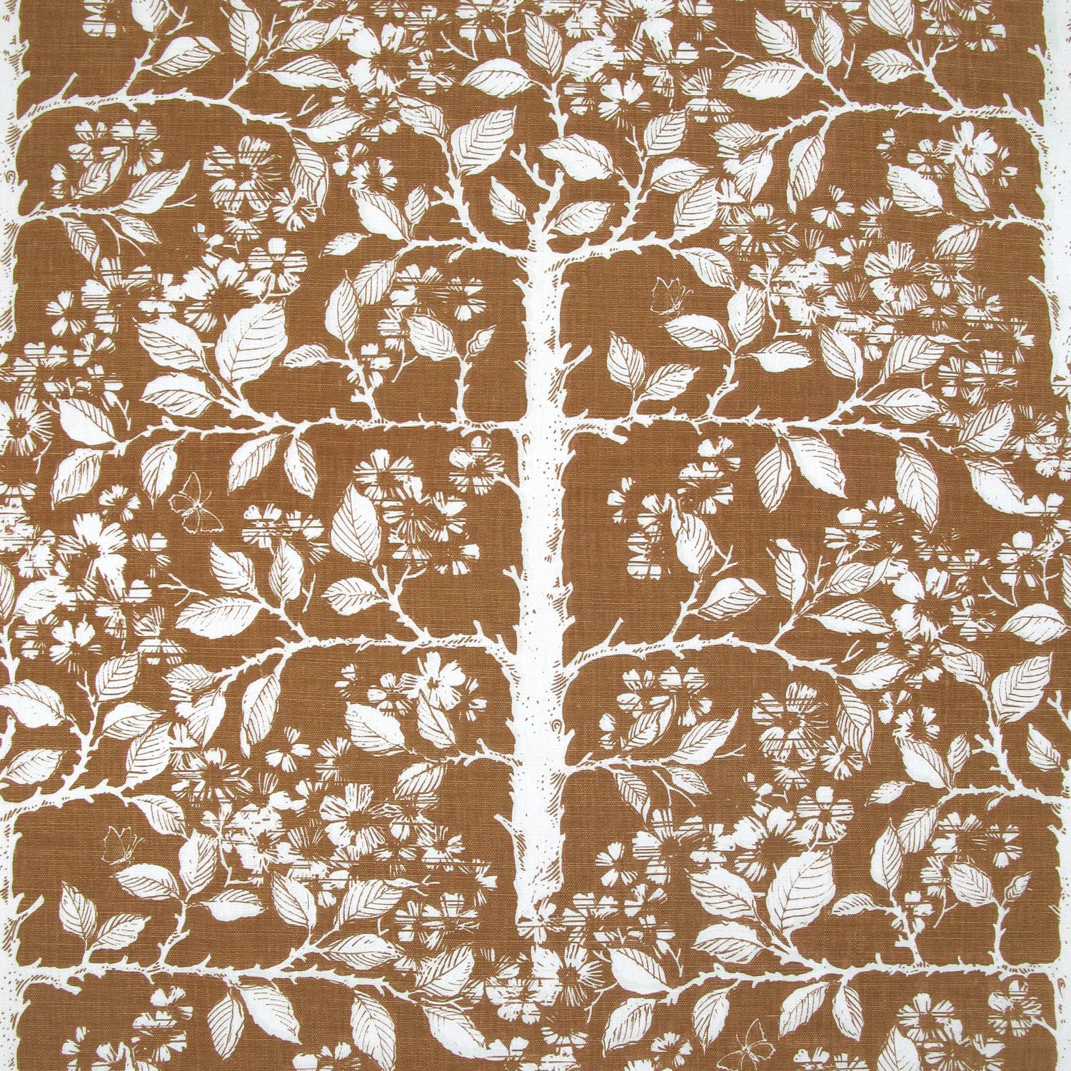 Detail of fabric in a large-scale tree and leaf print in cream on a brown field.