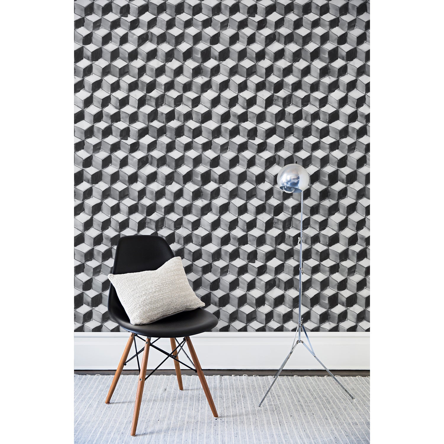 A chair and floor lamp in front of a wall papered in a hand-painted tumbling block pattern in black and gray on a white background.