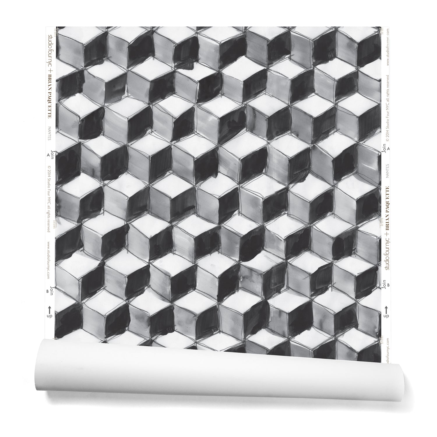 Partially unrolled wallpaper in a hand-painted tumbling block pattern in black and gray on a white background.