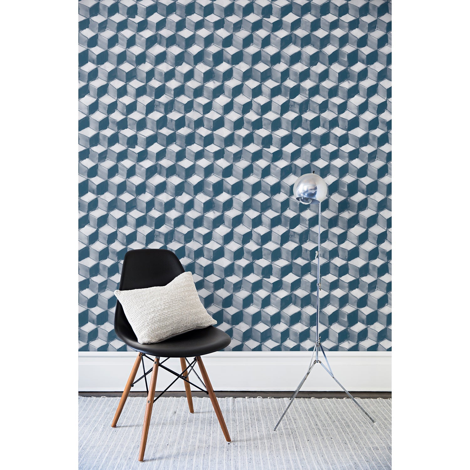 A chair and floor lamp in front of a wall papered in a hand-painted tumbling block pattern in shades of blue on a white background.