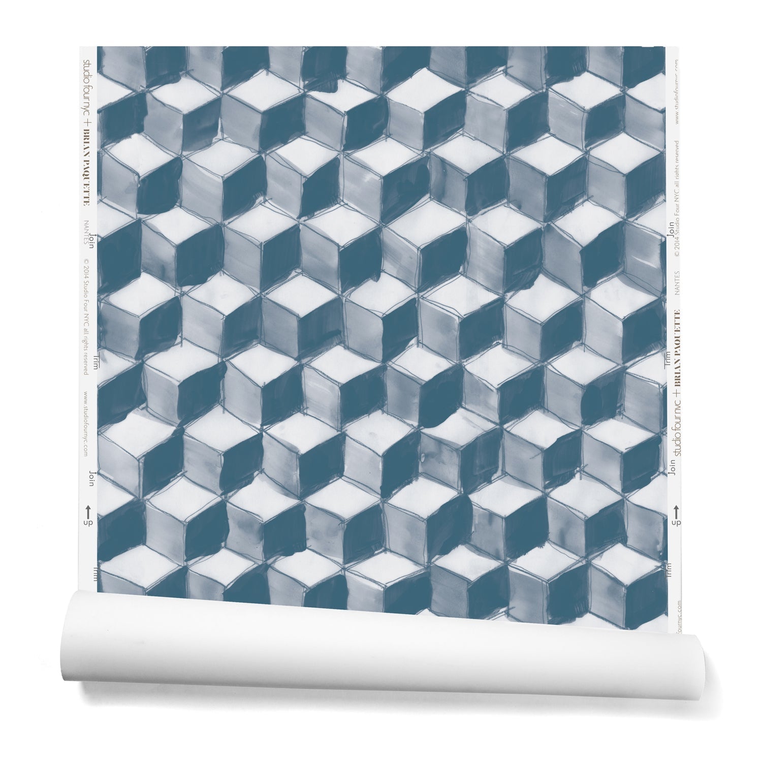 Partially unrolled wallpaper in a hand-painted tumbling block pattern in shades of blue on a white background.