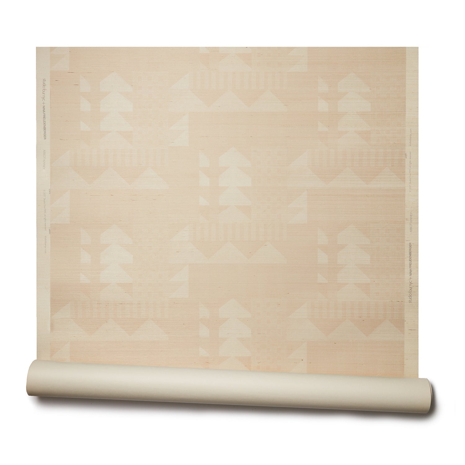 Partially unrolled wallpaper roll with layered geometric shapes in cream printed on a sandy tan background.