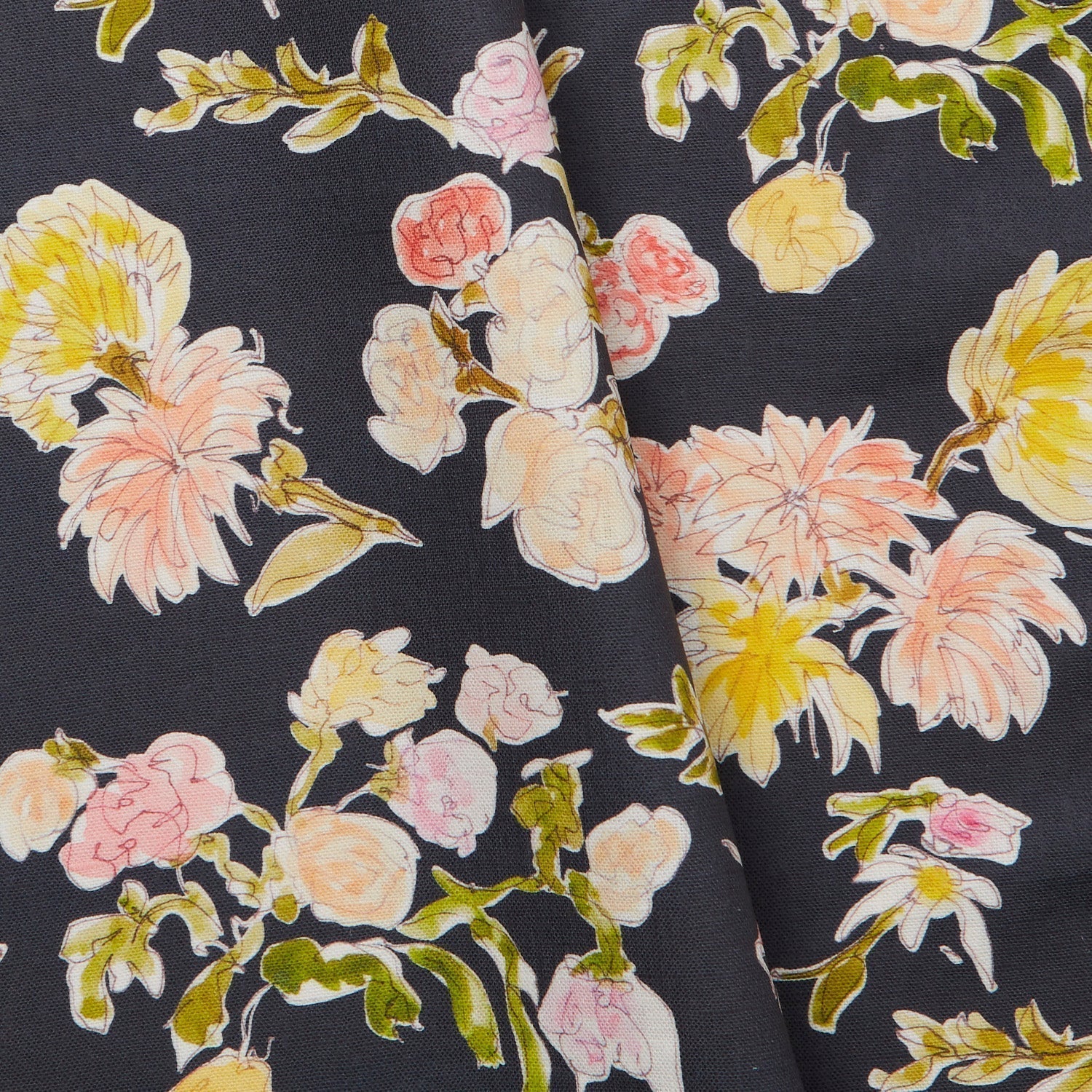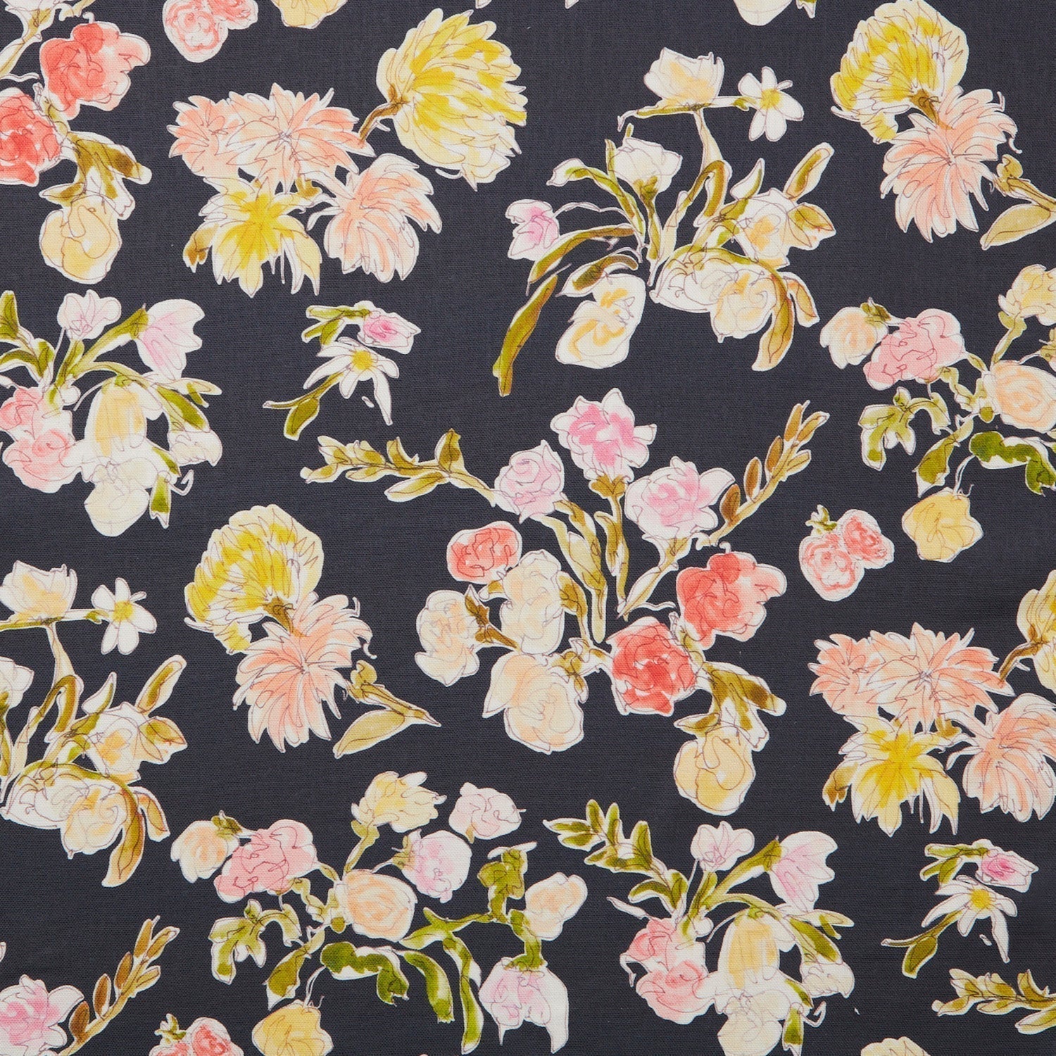 Linen swatch with a pattern of large-scale line-drawn flowers in gray ink with red, pink and yellow watercolors, on a black background.