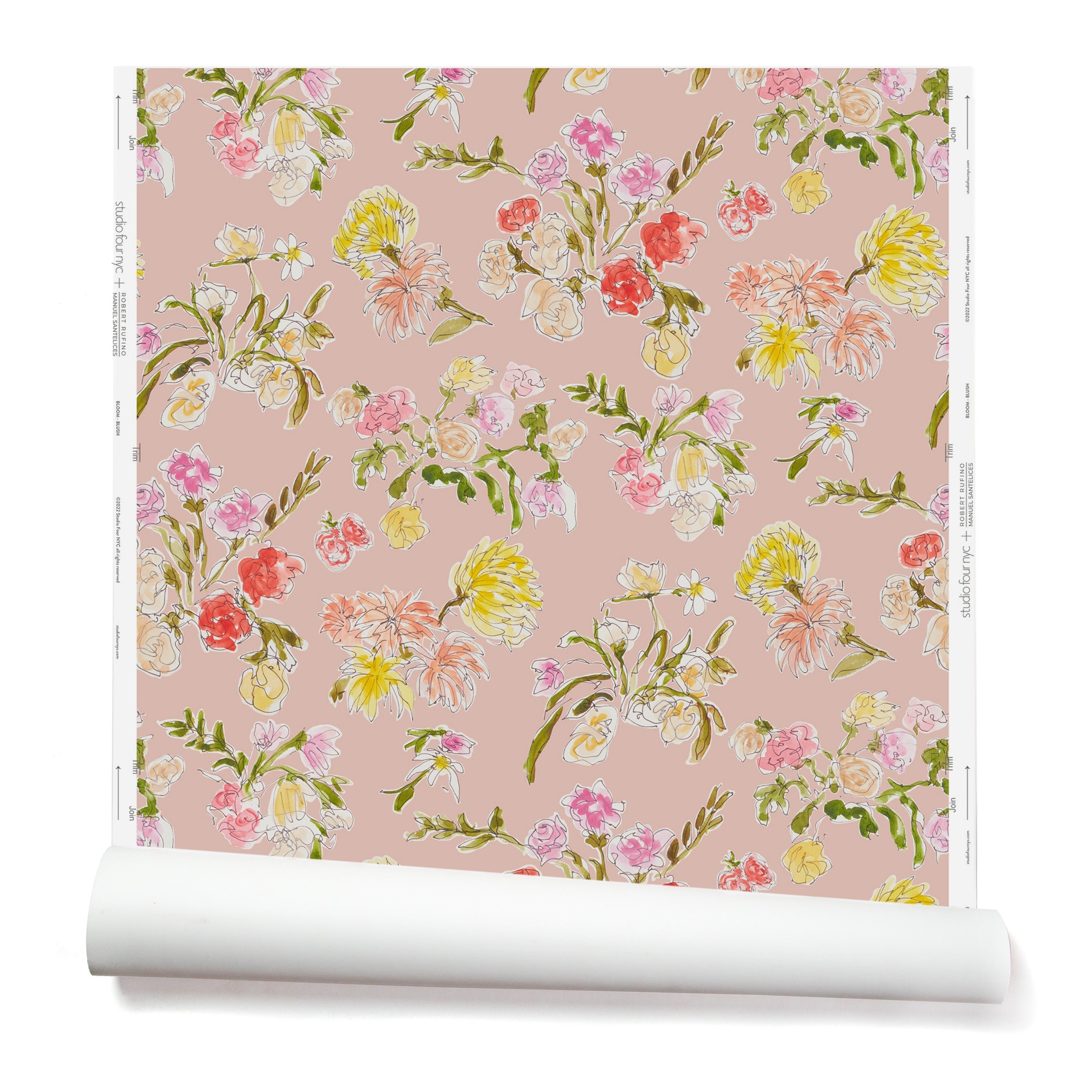 Partially unrolled wallpaper with a pattern of large-scale line-drawn flowers in gray ink with red, pink and yellow watercolors, on a pink background.