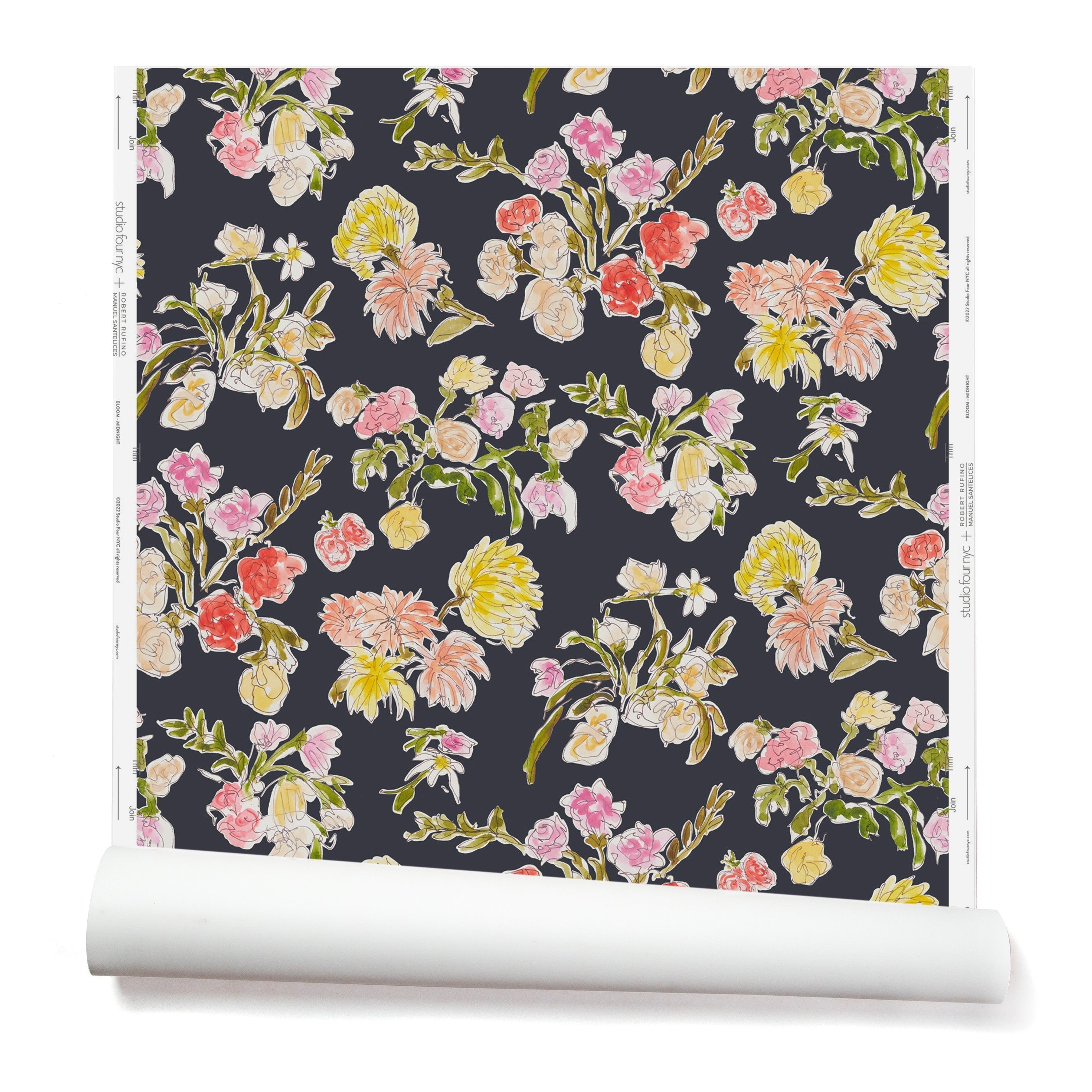 Partially unrolled wallpaper with a pattern of large-scale line-drawn flowers in gray ink with red, pink and yellow watercolors, on a black background.
