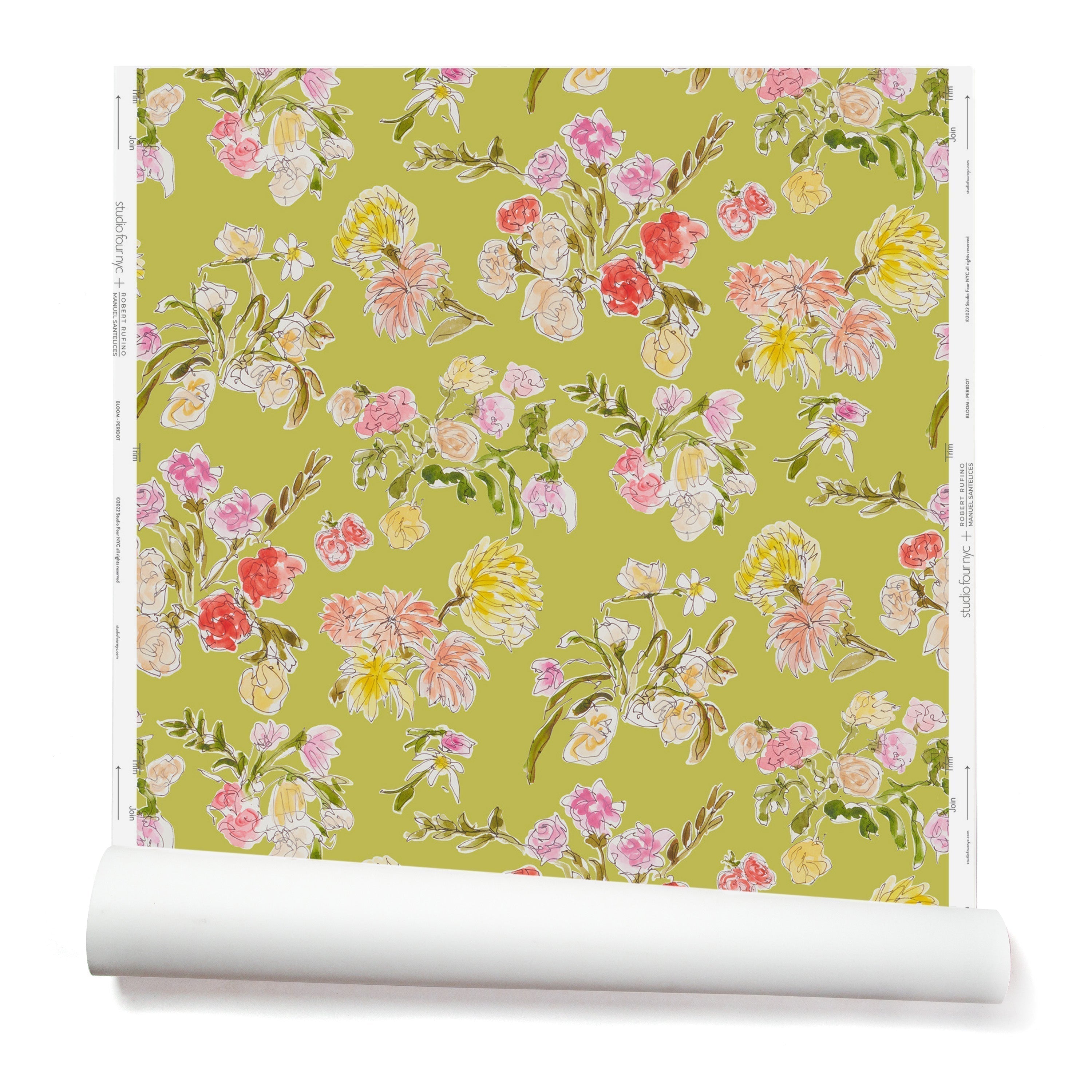 Partially unrolled wallpaper with a pattern of large-scale line-drawn flowers in gray ink with red, pink and yellow watercolors, on a light green background.