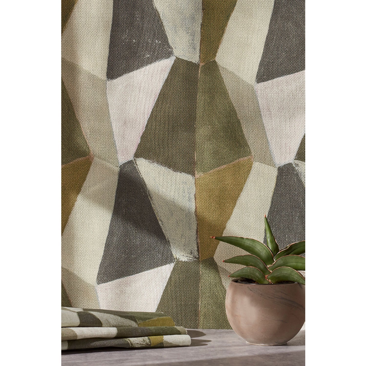 Detail image of a green patterned fabric and small spiky potted plant in front of a wall with mixed three dimensional diamond forms with black, white, taupe, dark forest green, dark sage green and a bright olive green on a textured paper, hover