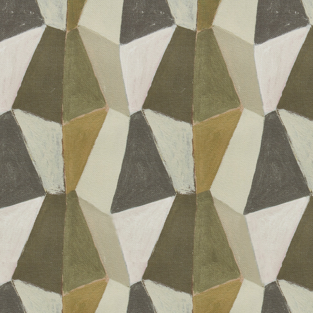 Detail swatch of a wallpaper pattern with mixed three dimensional diamond forms with black, white, taupe, dark forest green, dark sage green and a bright olive green on a textured paper.