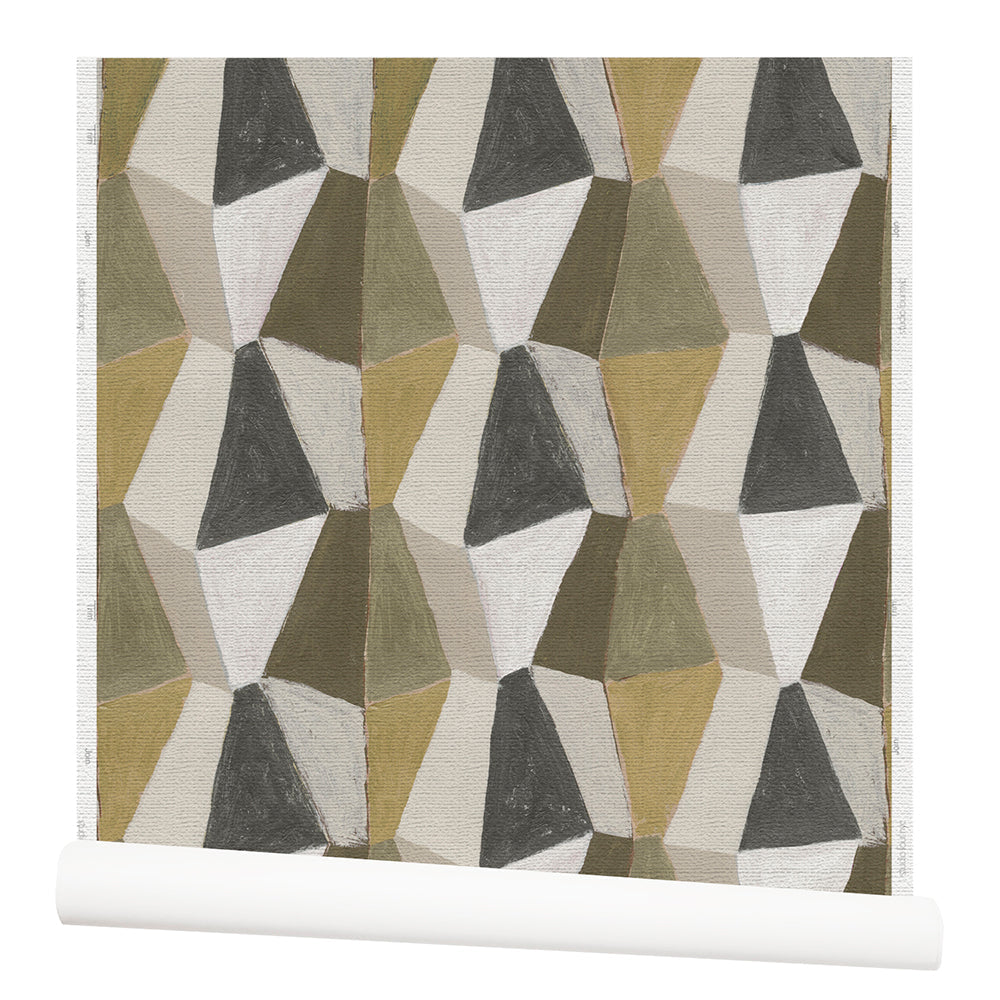 Wallpaper roll with mixed three dimensional diamond forms with black, white, taupe, dark forest green, dark sage green and a bright olive green on a textured paper.