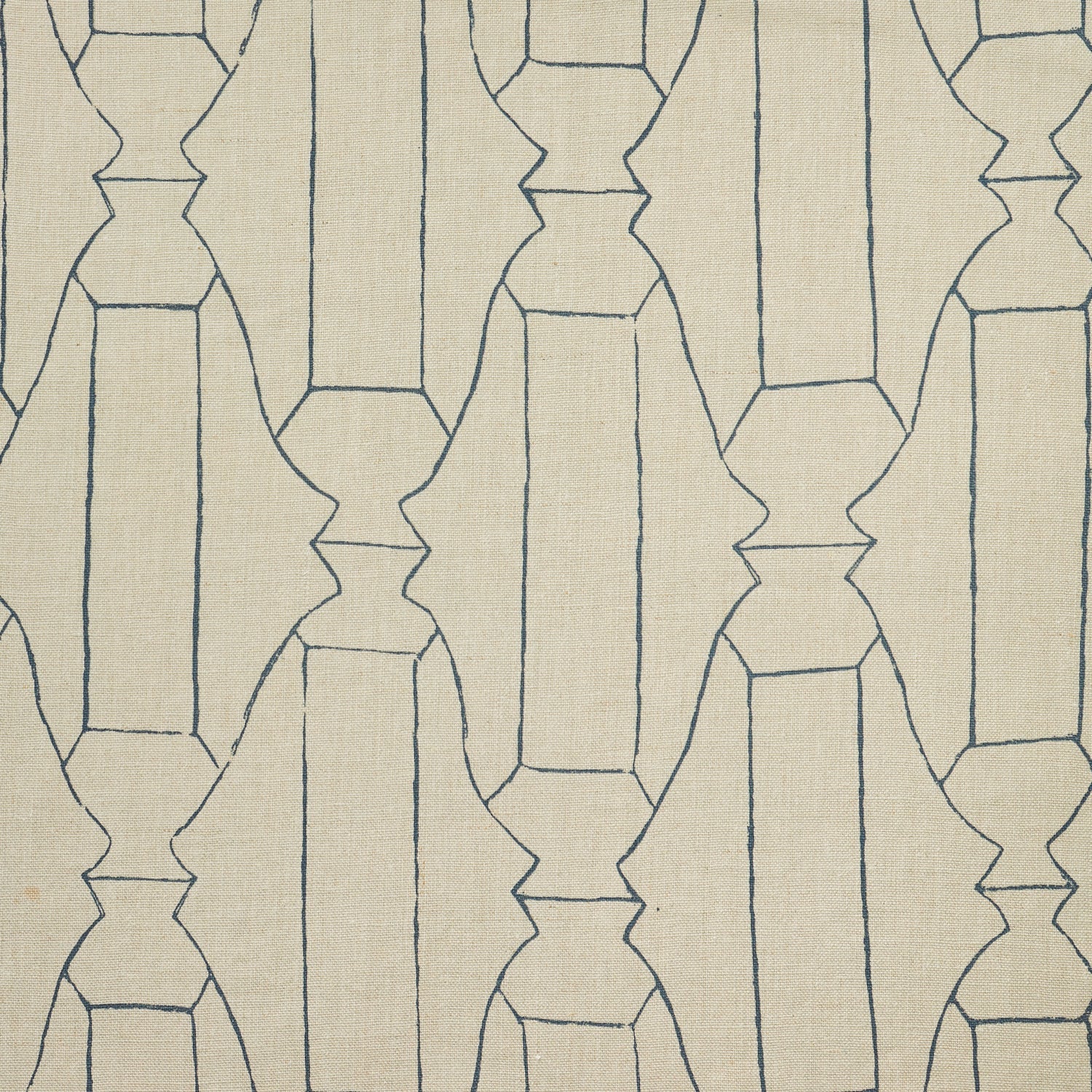 Woven fabric swatch in a repeating curvolinear print in navy on a tan field.