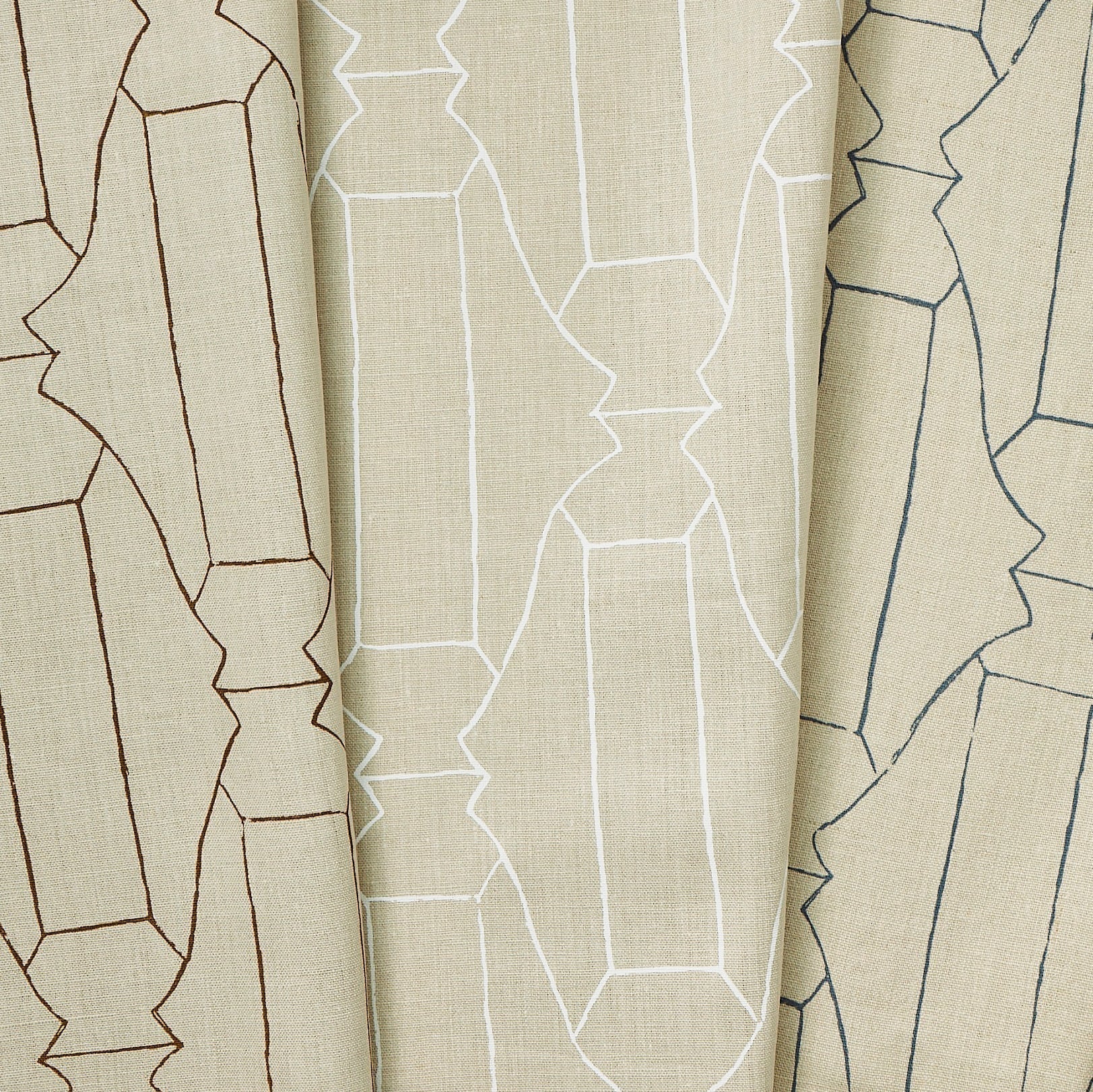 A group of draped woven fabrics, each in a different colorway of a repeating curvolinear print.