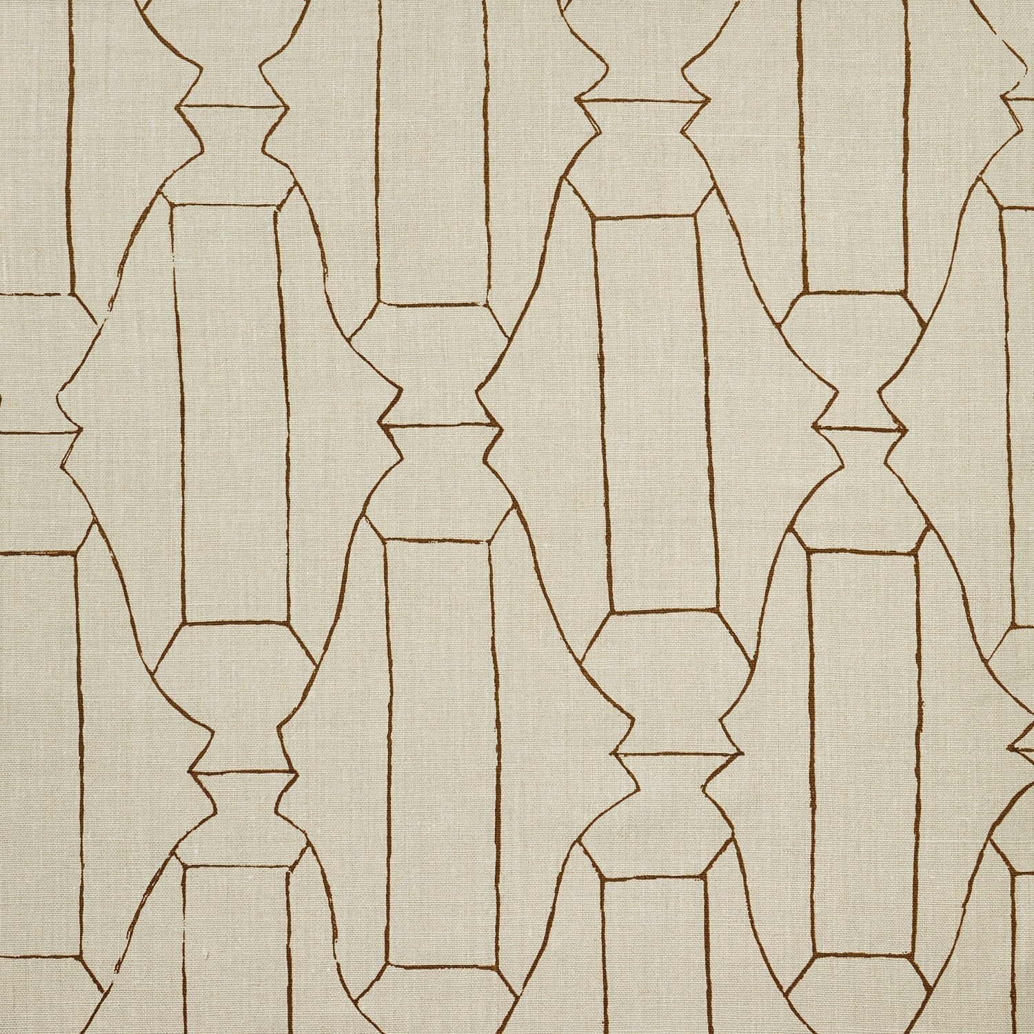 Woven fabric swatch in a repeating curvolinear print in rust on a tan field.