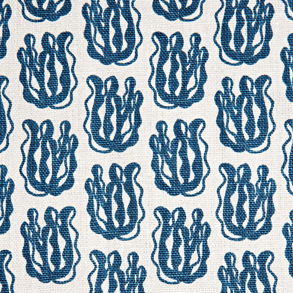 Woven fabric swatch with a repeating cartoon seaweed print in blue on a white background.