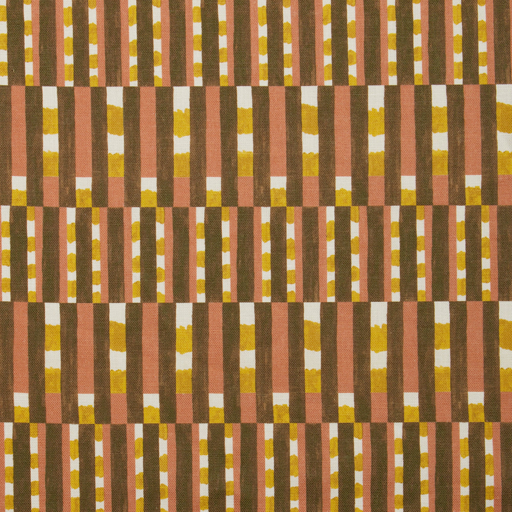 Fabric with pattern of vertical stripes of pink, warm olive green and dashes of yellow and white.