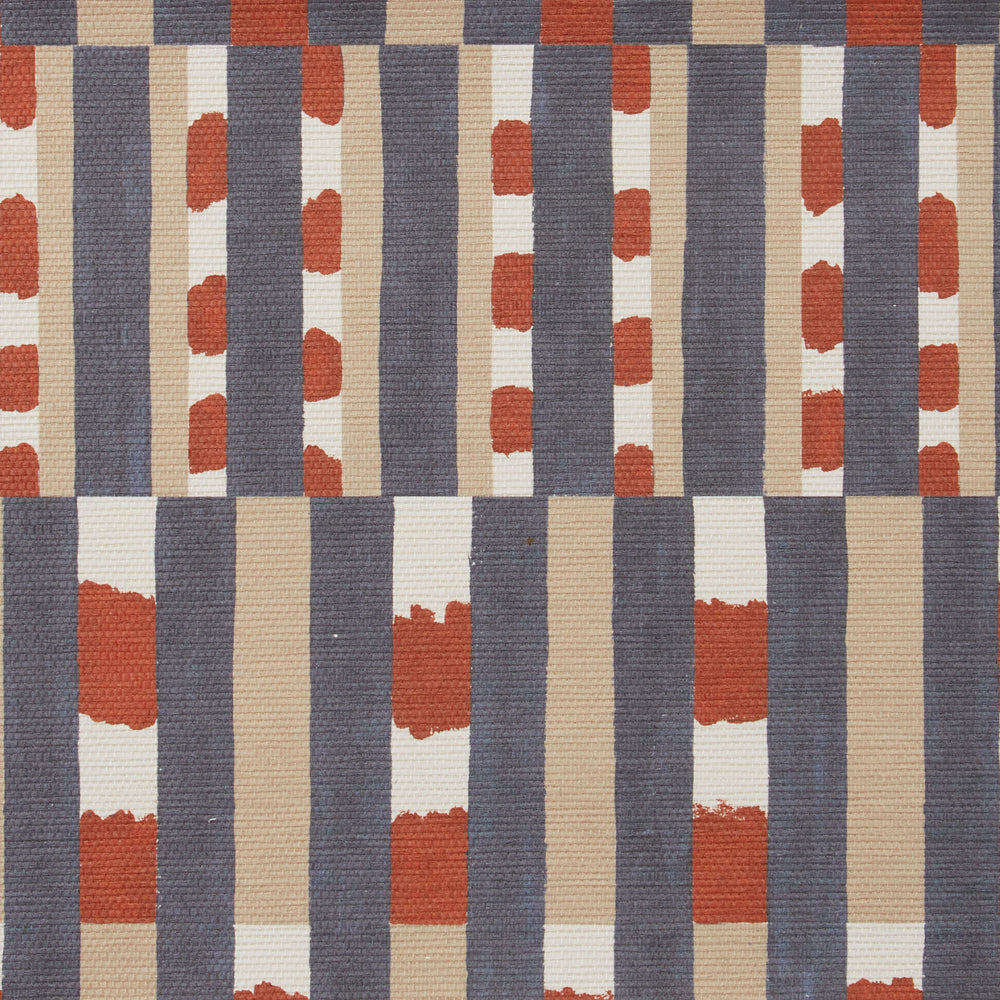 Wallpaper roll with a pattern of vertical stripes of light brown, navy blue and dashes of rust red and white.