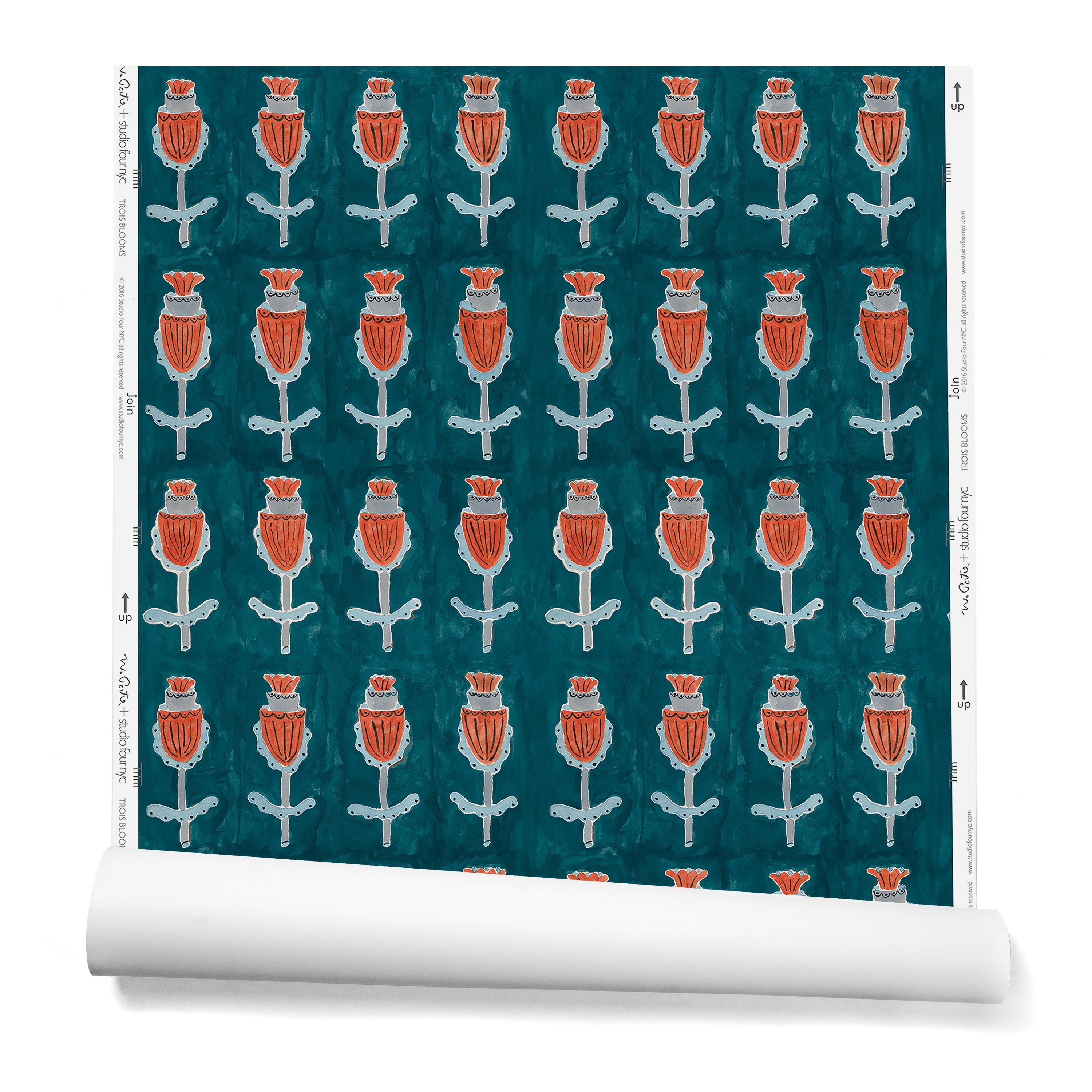 A hanging roll of wallpaper with repeating rows of a watercolor flowers in red, gray and blue on a turquoise background.