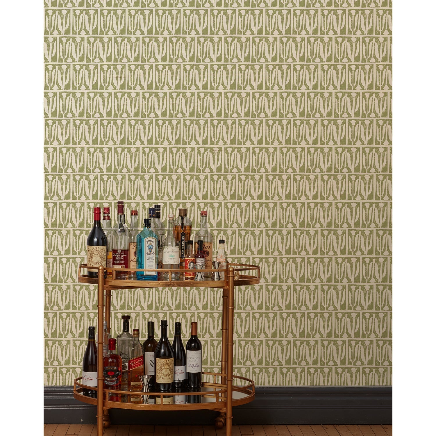 A bronze bar cart in front of a wall papered in an abstract tulip print in a repeating stripe on a sage field.