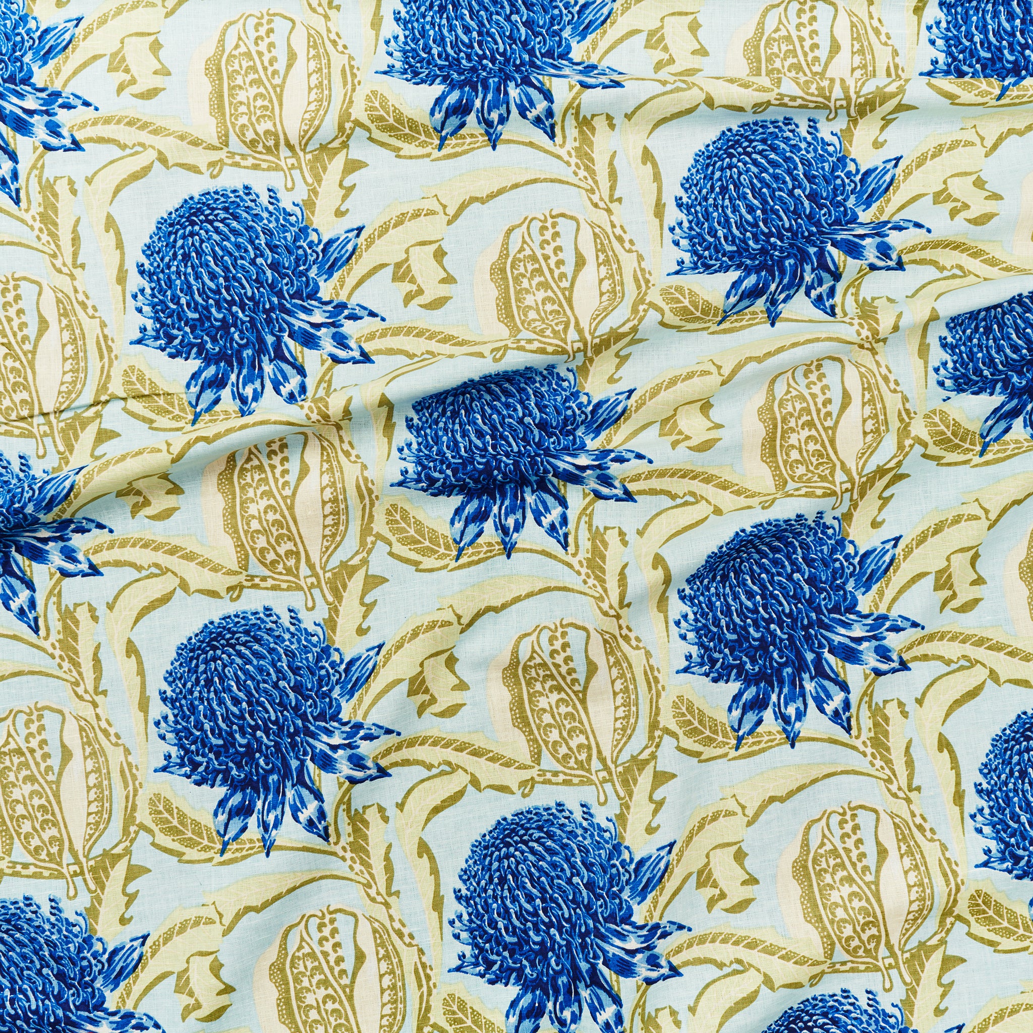 Draped fabric in a large-scale floral print in shades of royal blue and soft green on an acqua field.