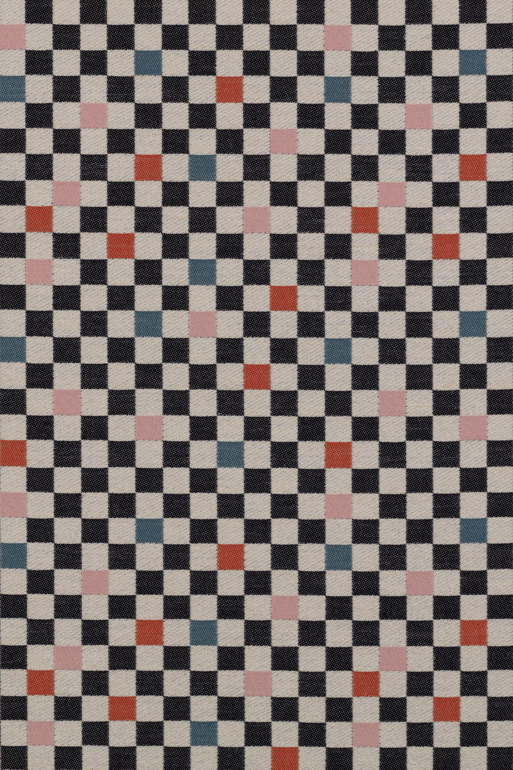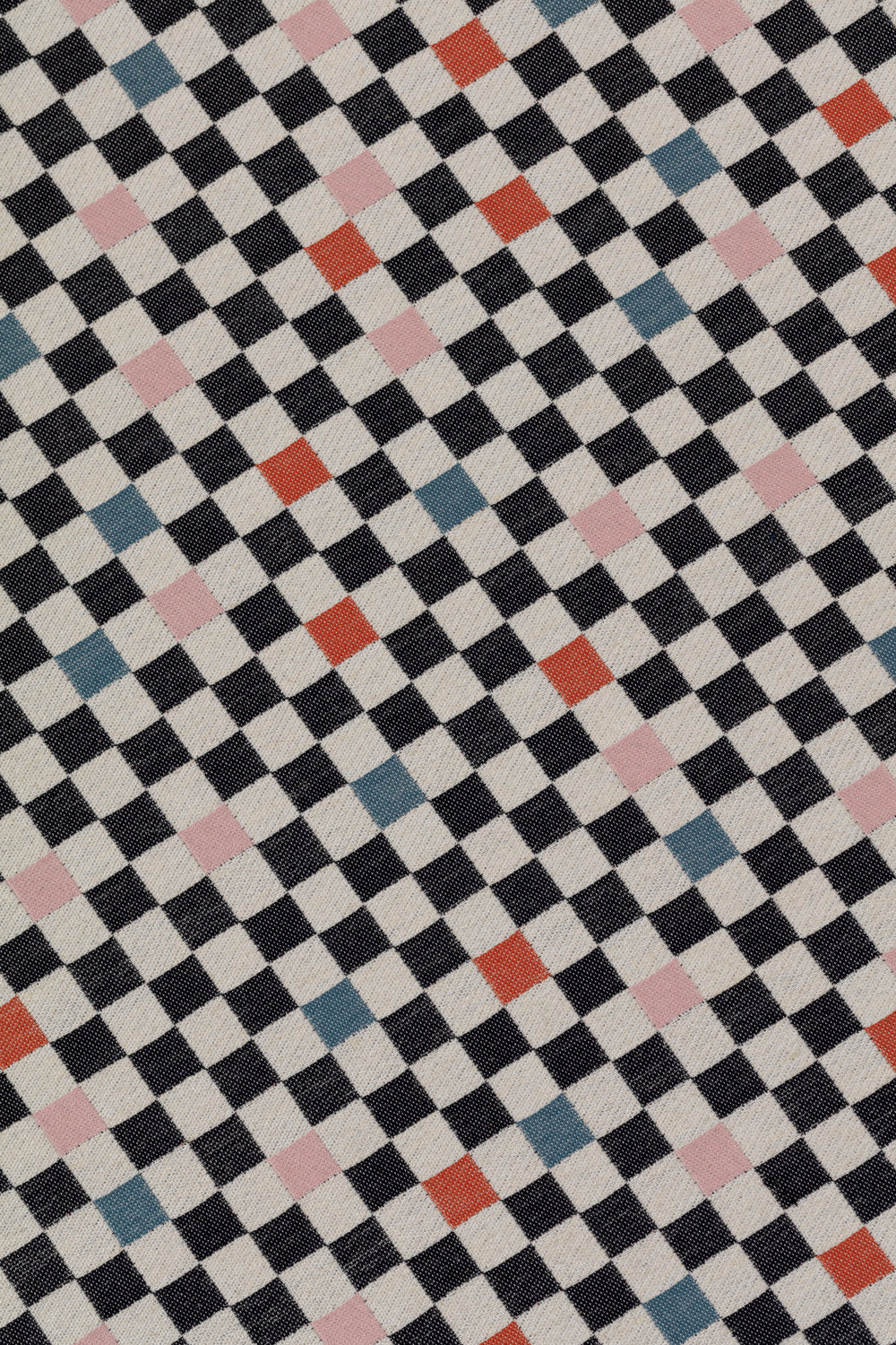 Detail of jacquard fabric in a checked pattern in shades of pink, red, blue and black on a tan field.