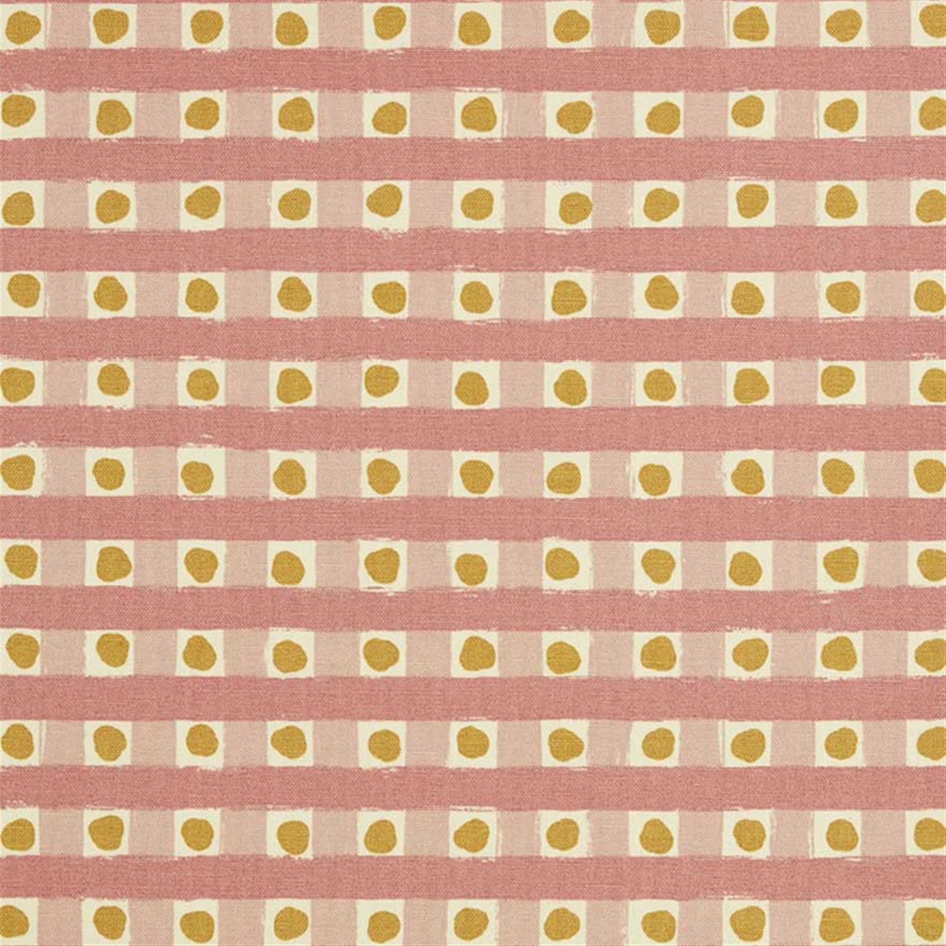 Detail of fabric in a playful dotted check print in pink and mustard on a cream field.