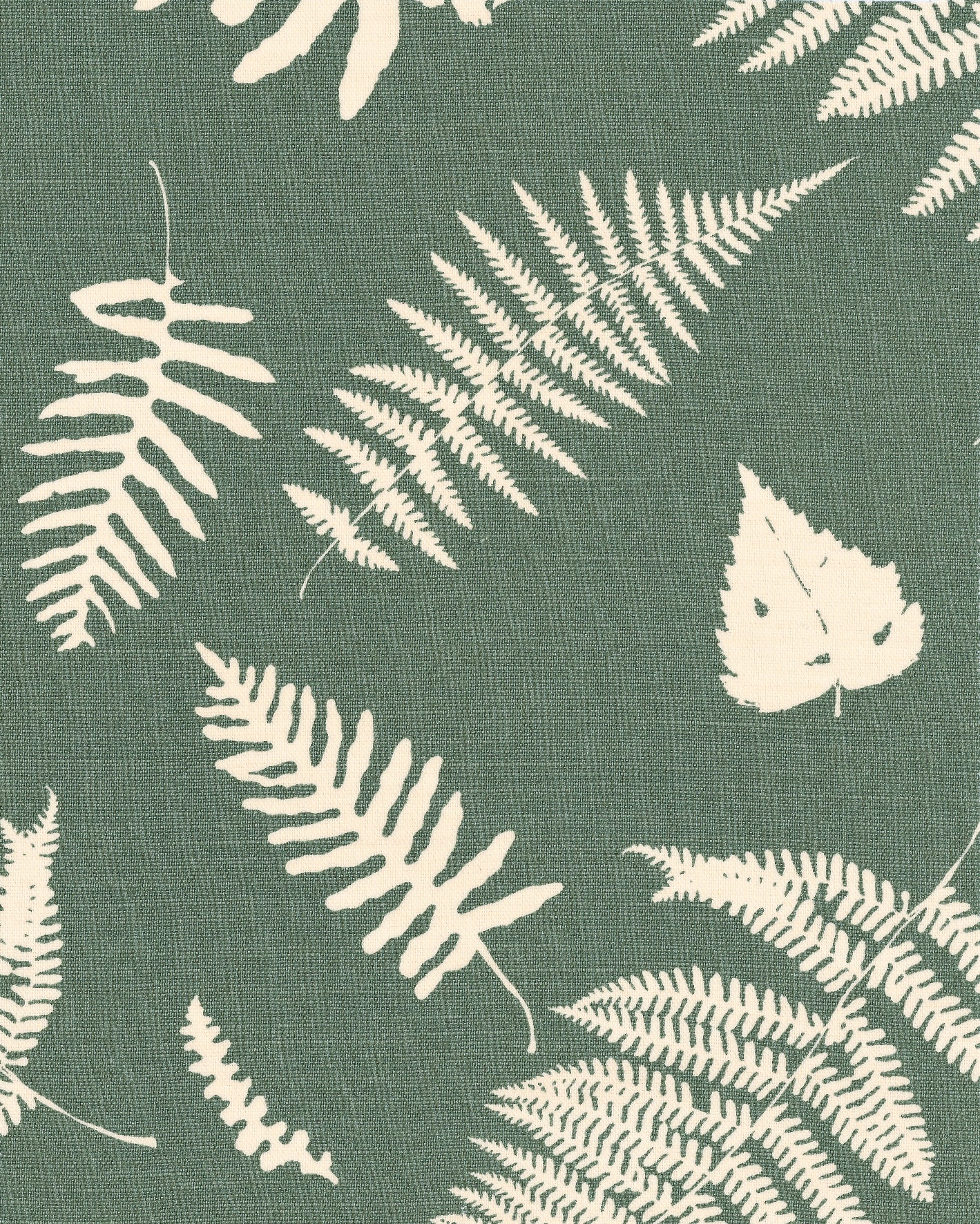Detail of fabric in a repeating fern and dragonfly print in cream on a dark green field.