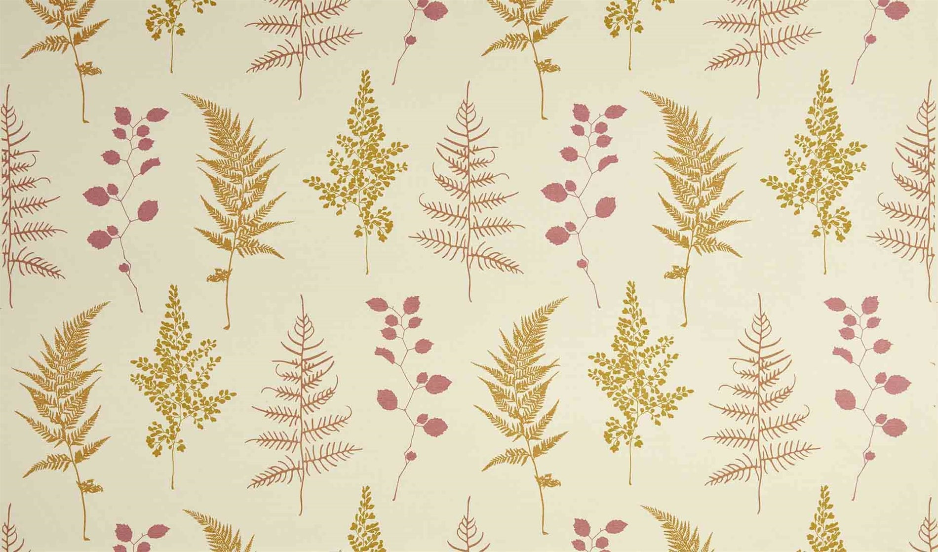 Close-up of fabric in a repeating leaf print in pink and mustard on a cream field.