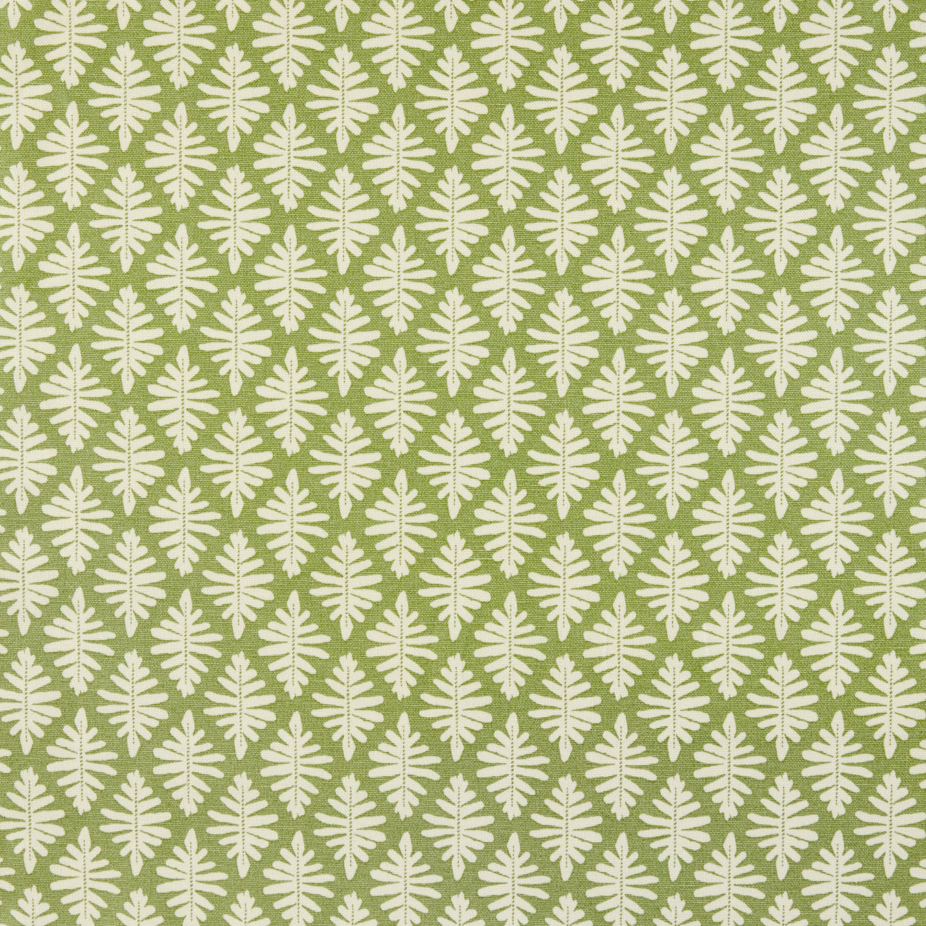 Detail of fabric in a repeating fern leaf print in white on a green field.