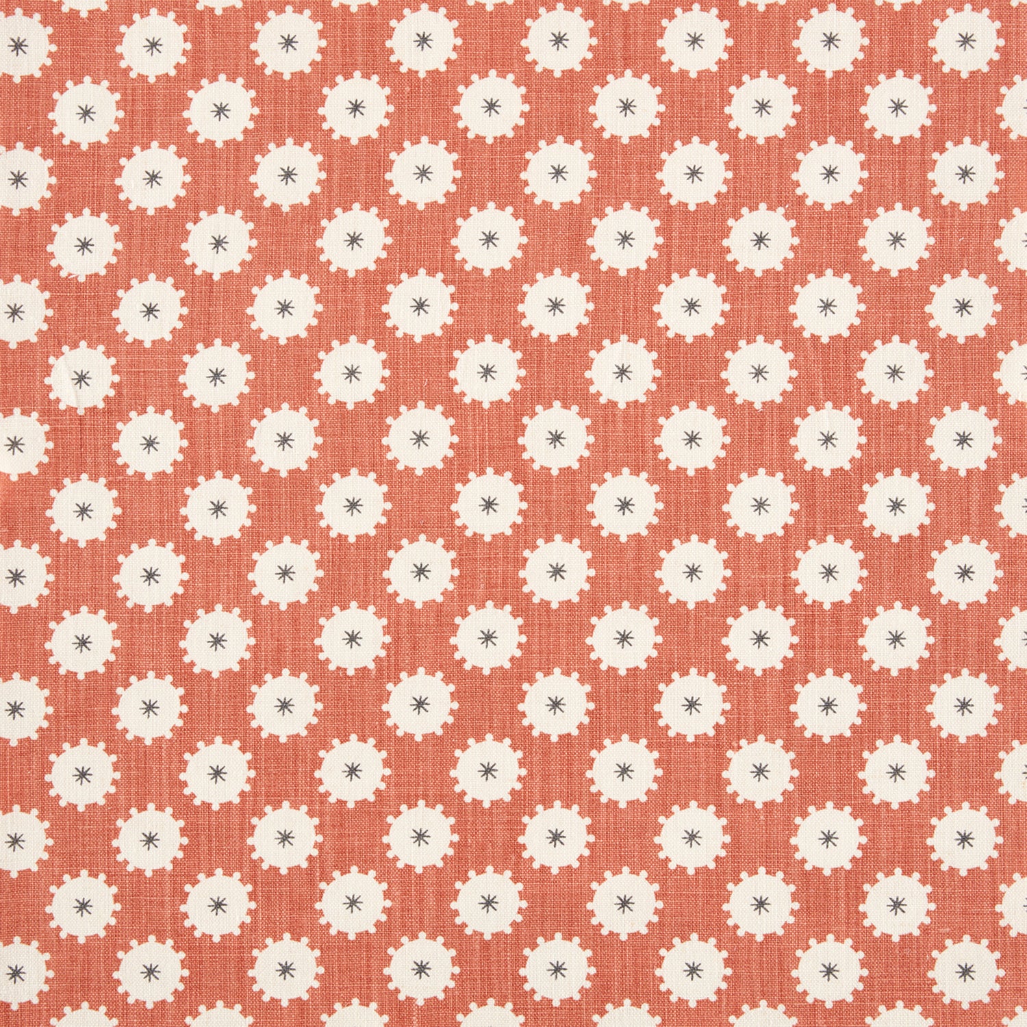 Detail of fabric in a repeating blossom print in white on a burnt orange field.