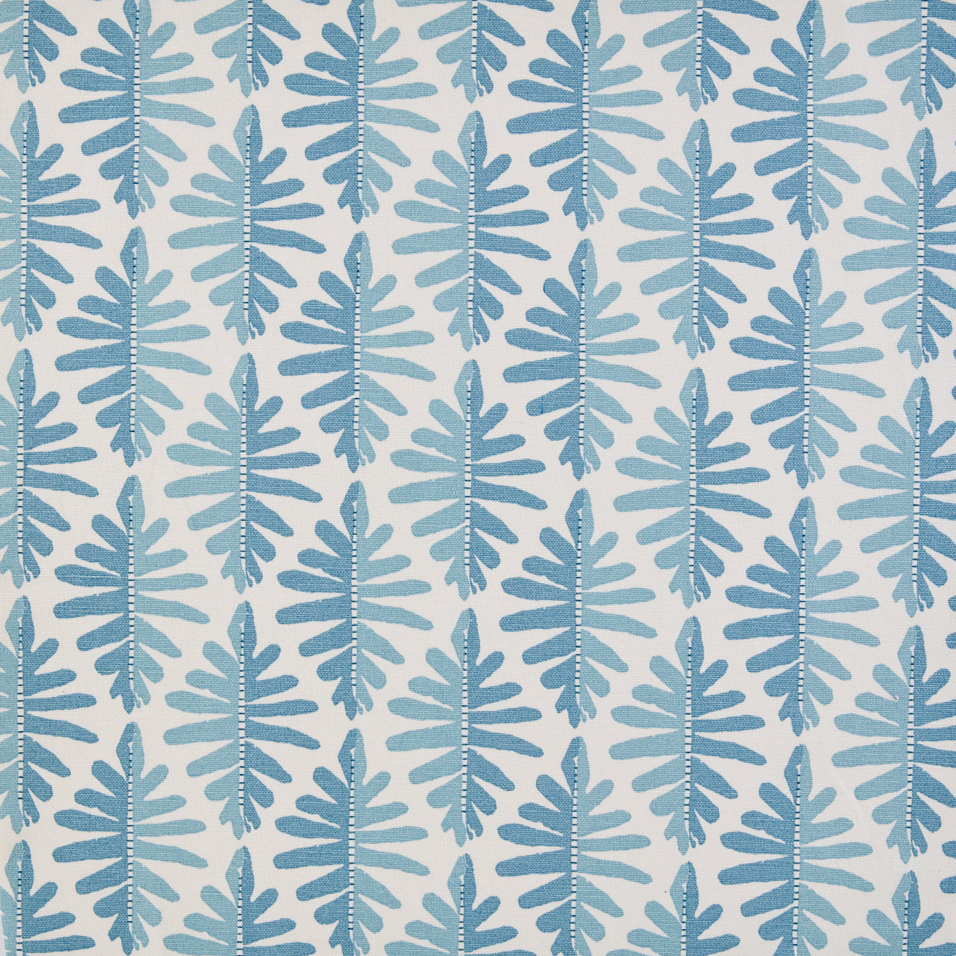 Detail of fabric in a fern leaf print in shades of blue on a white field.