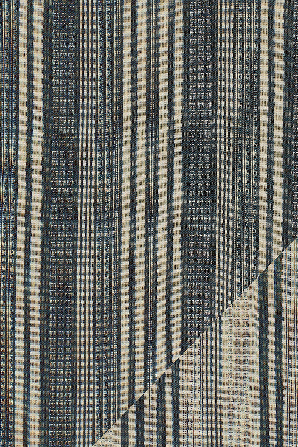 Draped woven fabric in a mixed width stripe design in ivory and navy blue.