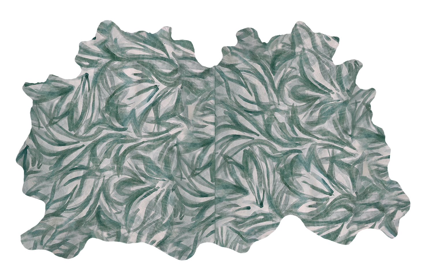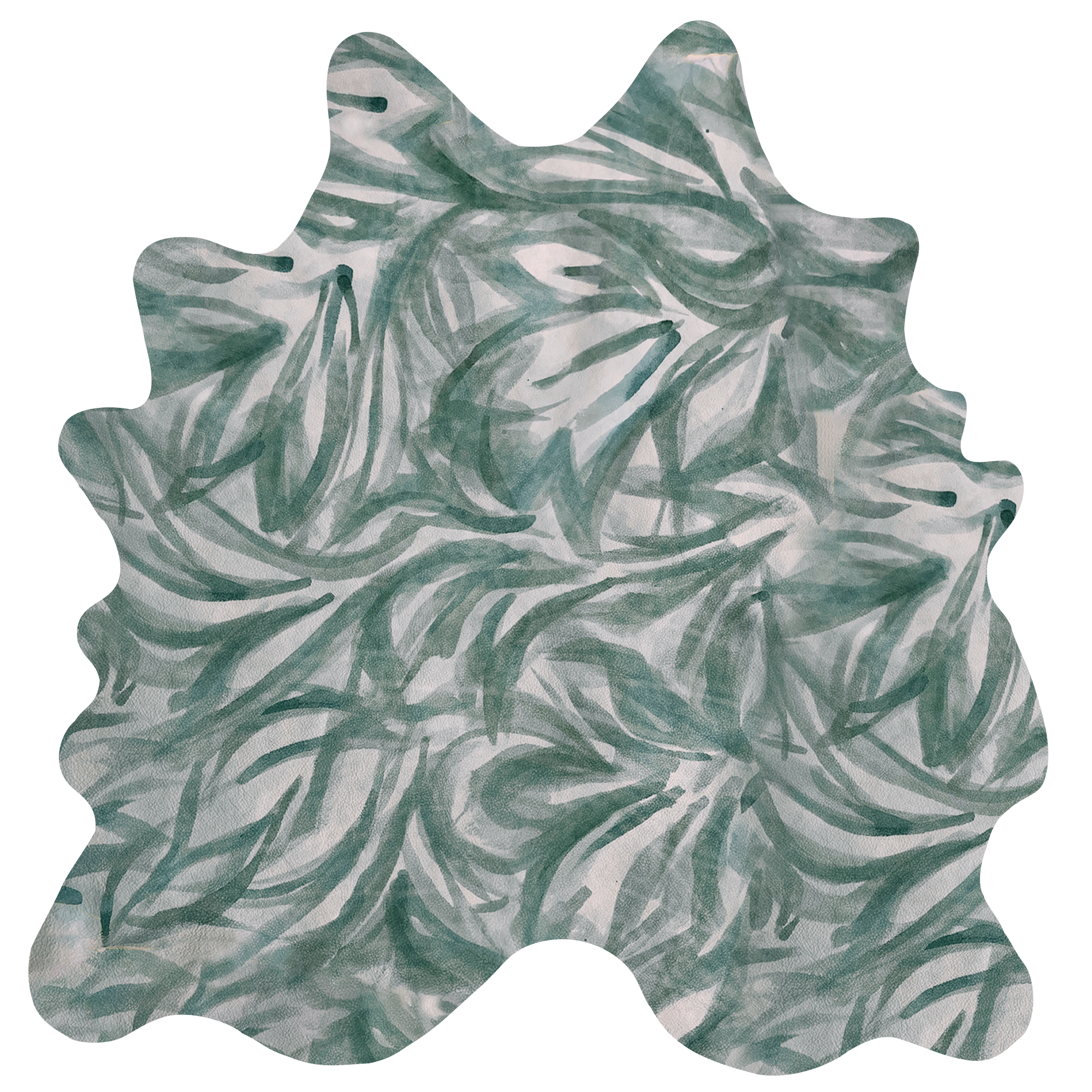 Detail of a cowhide rug in cream with a painterly botanical overlay in green and gray.