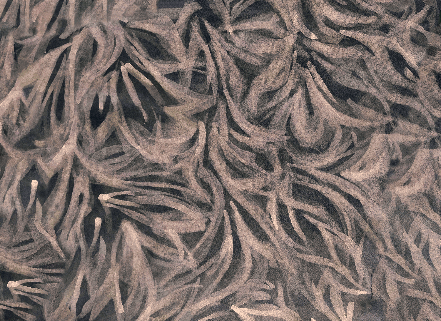 Detail of upholstery leather in black with a painterly botanical overlay in pink.