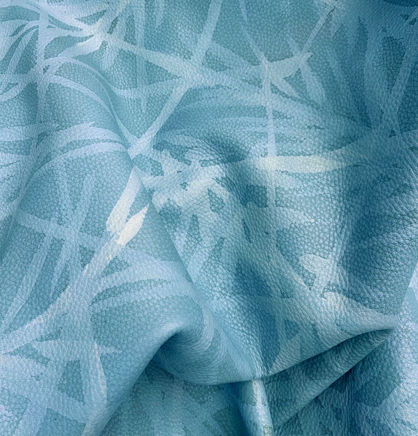 Close-up of a draped cowhide rug in blue with a painterly botanical overlay.