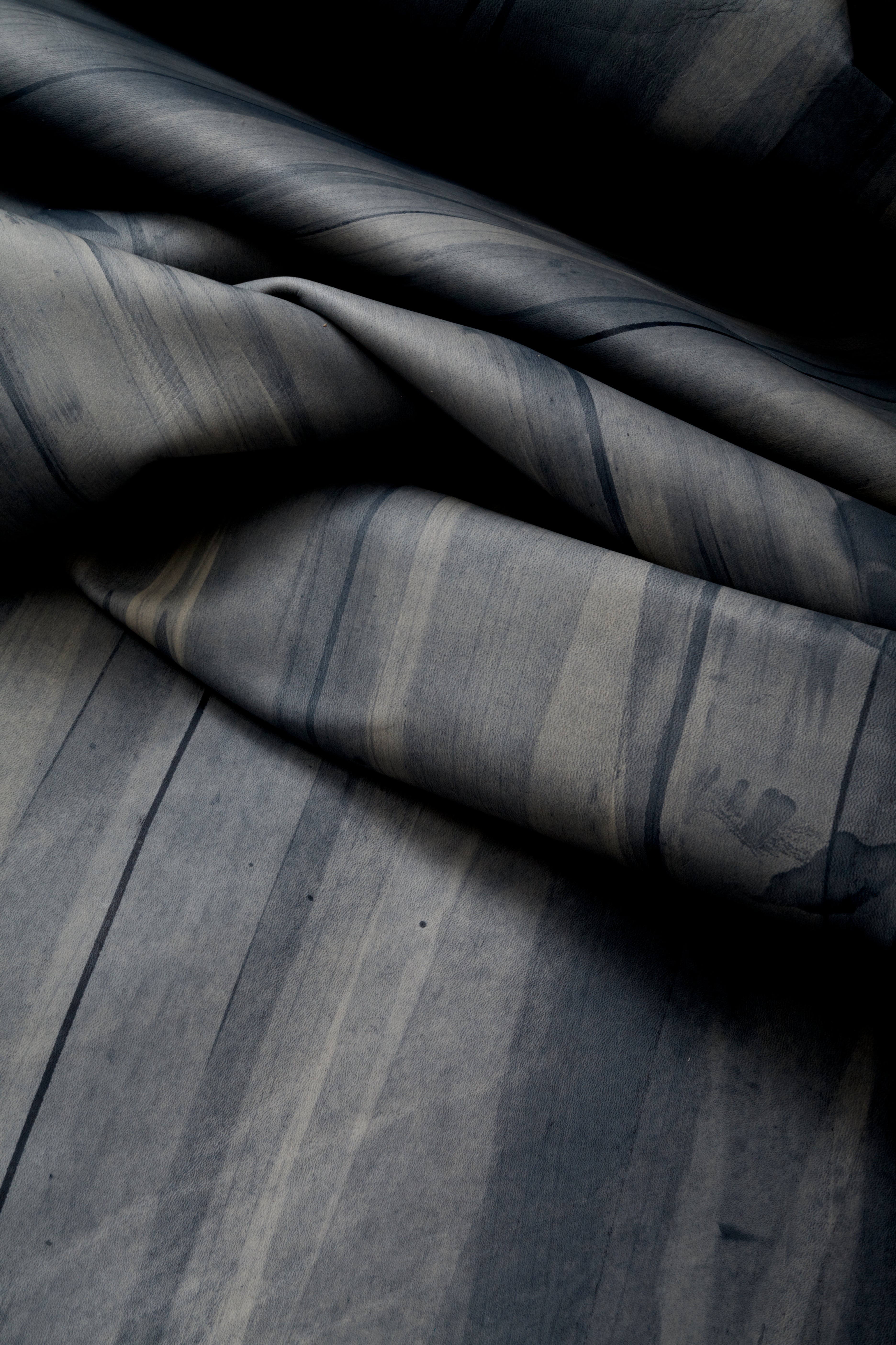 Draped cowhide rug in blue with an abstract stripe overlay in shades of navy and gray.