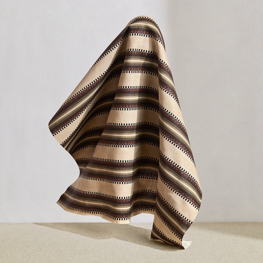 Hanging fabric in complex geometric stripe in brown, tan, orange, light purple and black on a cream field.